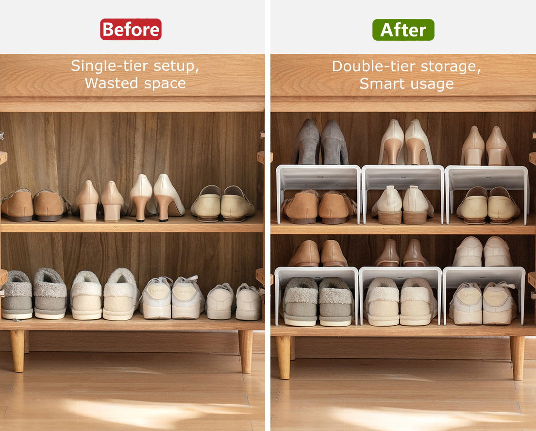 Say goodbye to cluttered shoe cabinets with this adjustable shoe slot organizer. Designed to stack shoes vertically, it doubles your storage space while keeping pairs neat and easy to access. With adjustable height, it fits everything from sneakers to high heels.