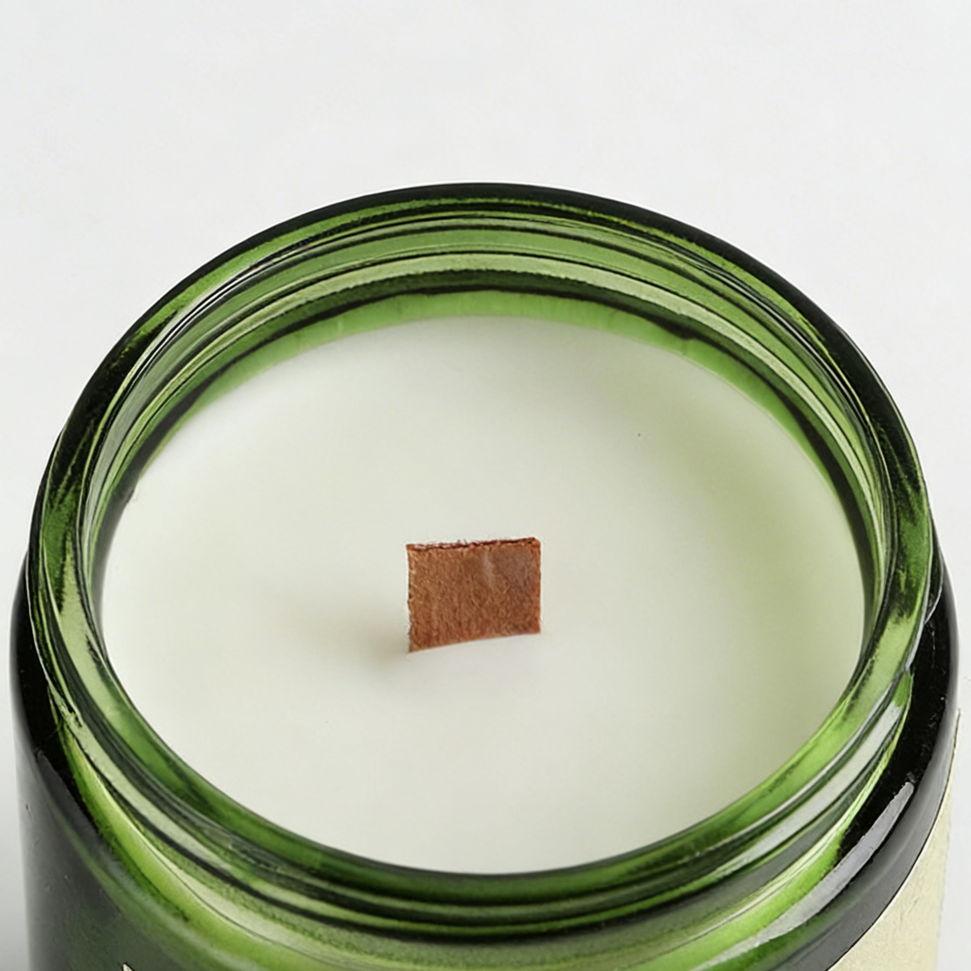 An elegant, eco-friendly soy wax candle featuring a smokeless wooden wick and an emerald green glass jar. Inspired by “Wilderness Spring,” it offers a minimalist Oriental aesthetic for mindful relaxation.