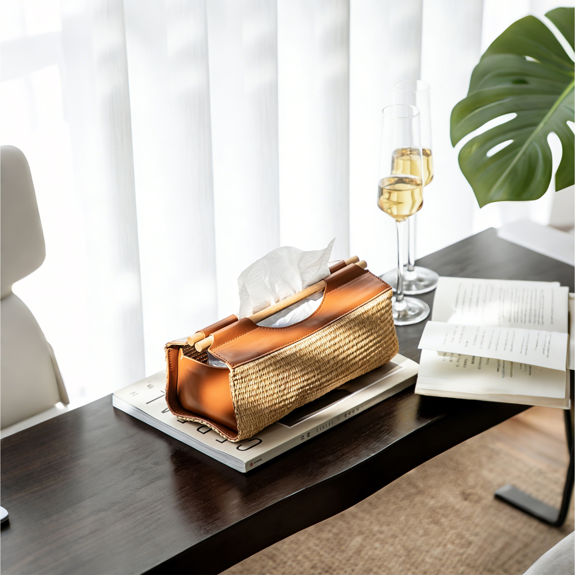 This handwoven rattan tissue box features a natural, textured finish and a secure lid, ideal for adding a warm, organic touch to dining tables and living room counters.