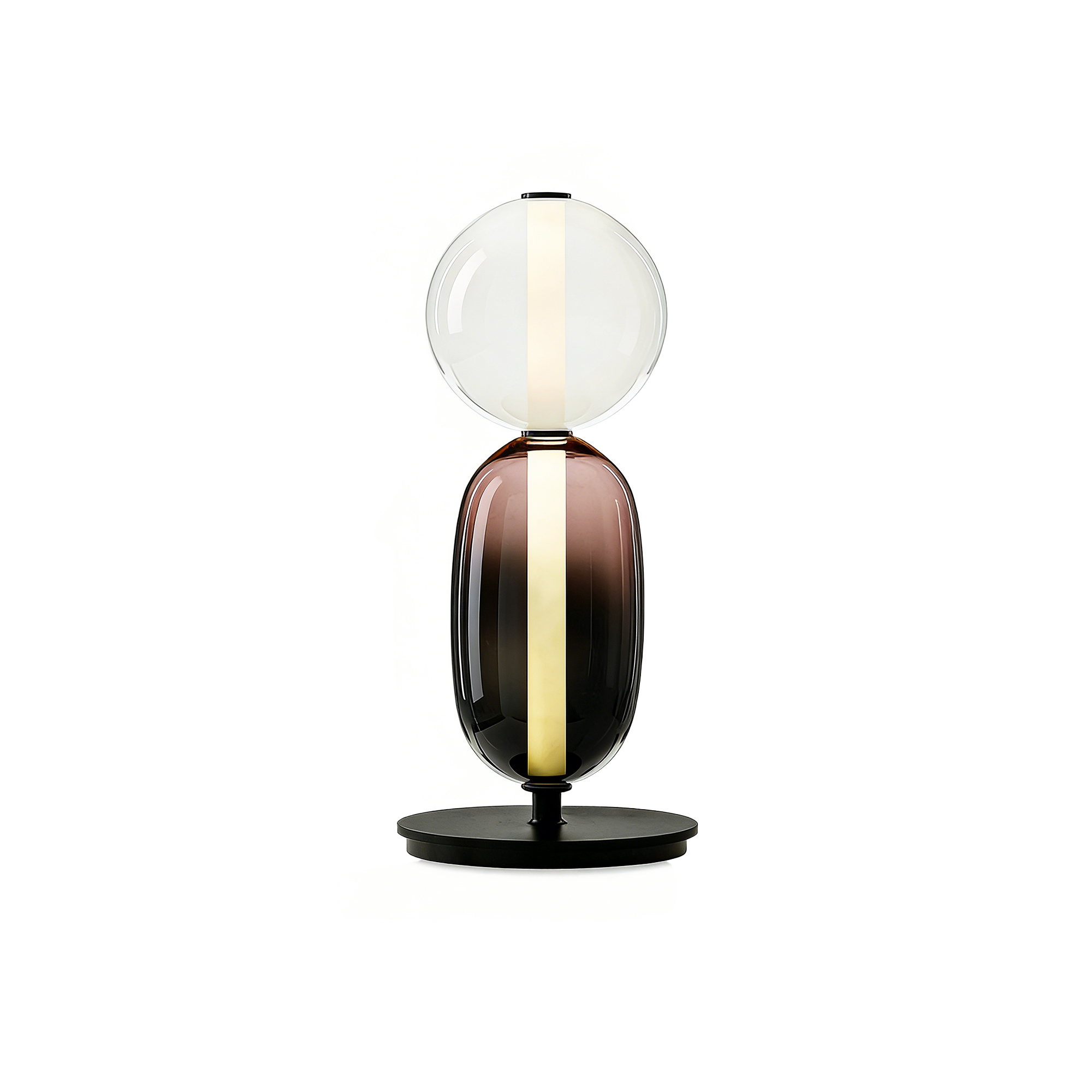 Distinctive stacked glass structure with a circular top and elongated base creates a refined, artistic silhouette.