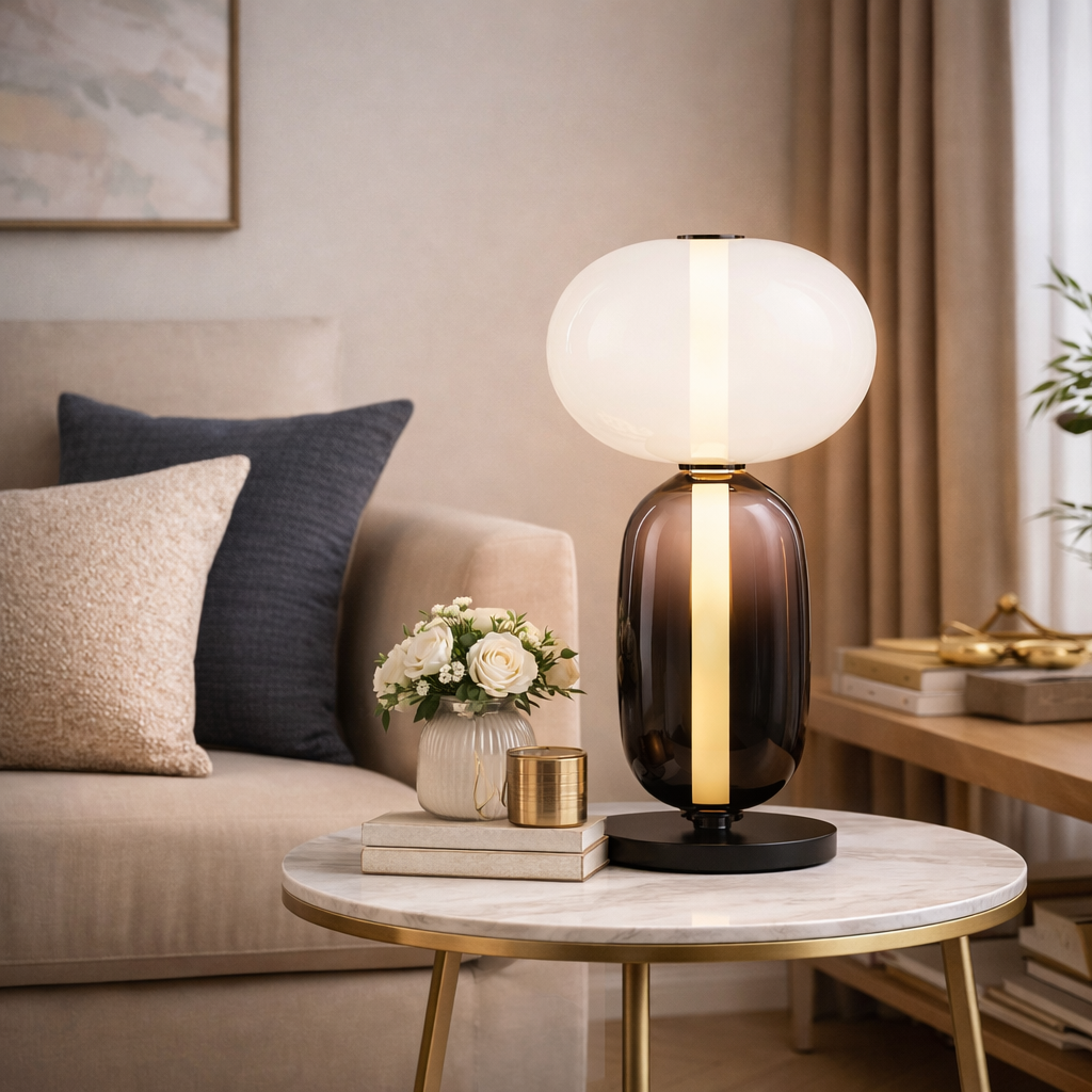 A contemporary table lamp featuring a layered glass design and integrated light source, combining artistic form with soft ambient illumination—perfect for modern and stylish interiors.