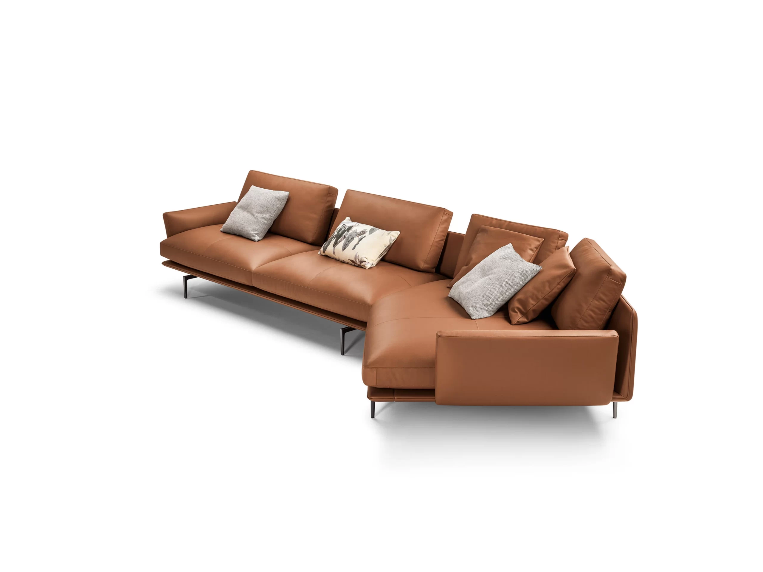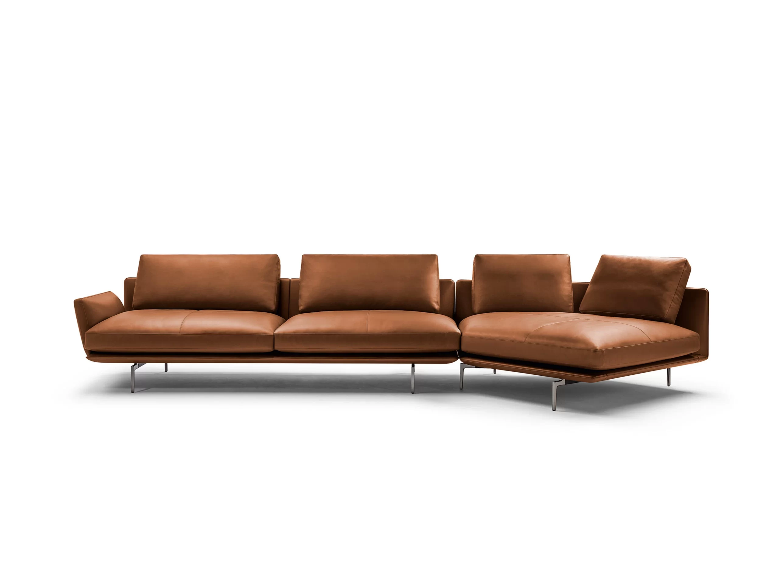 With its extended chaise configuration (374 × 94/120 × 73 cm), the sofa offers flexibility and ample space for relaxation without compromising visual lightness.