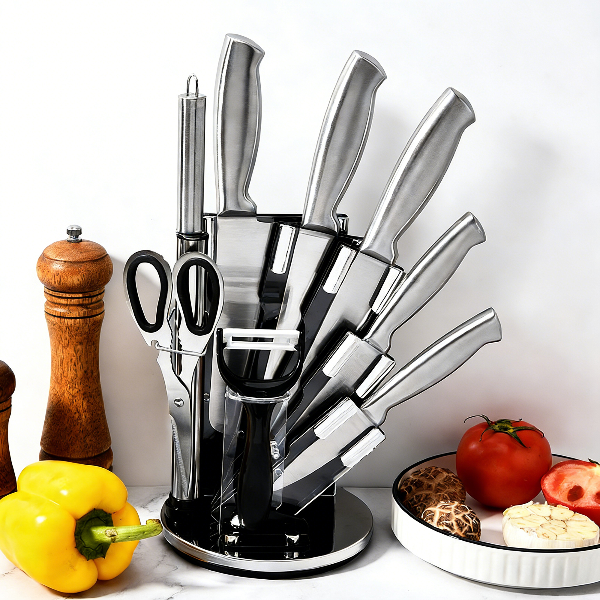 Upgrade your culinary experience with this comprehensive 8-piece stainless steel kitchen knife set. Designed for both functionality and style, the set includes a variety of blades to handle all your cutting, slicing, and dicing needs efficiently. Each knife features a comfortable, ergonomic handle for a secure grip, while the sharp, durable blades ensure smooth, precise performance. The set is organized in a sleek, rotating storage block, saving valuable countertop space. Complete with kitchen shears, a peeler, and a honing rod, this set provides a modern, convenient solution for any home cook looking to elevate their kitchen essentials.