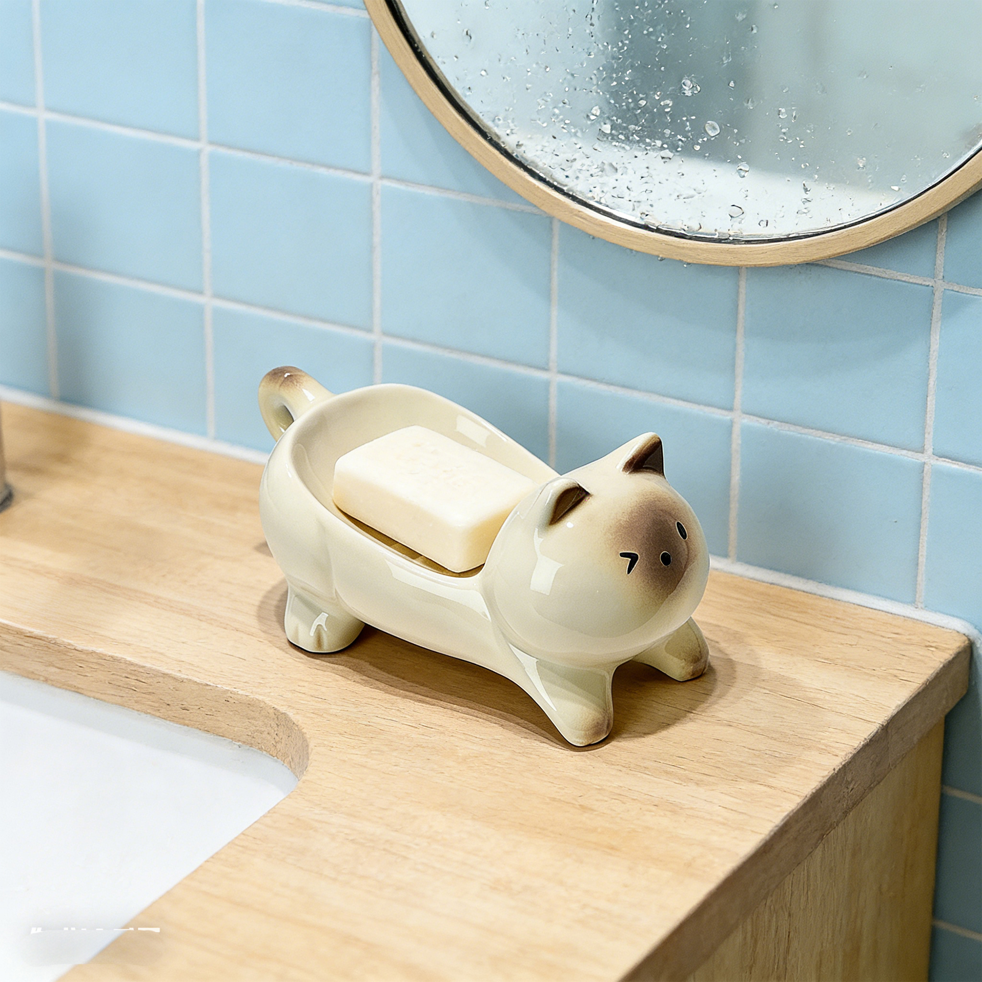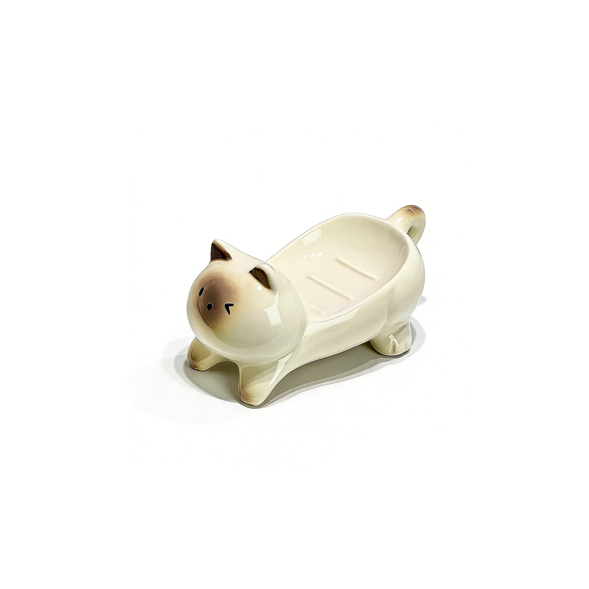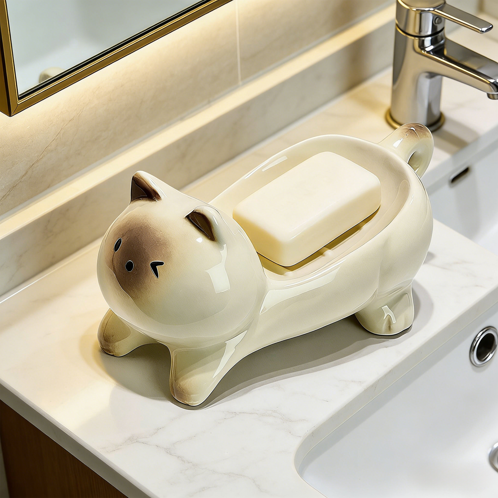 This charming cat-shaped soap dish is crafted from smooth, glossy ceramic. Its built-in drainage holes keep soap dry, while the playful Siamese cat design adds a fun, decorative touch to any bathroom or kitchen sink area.