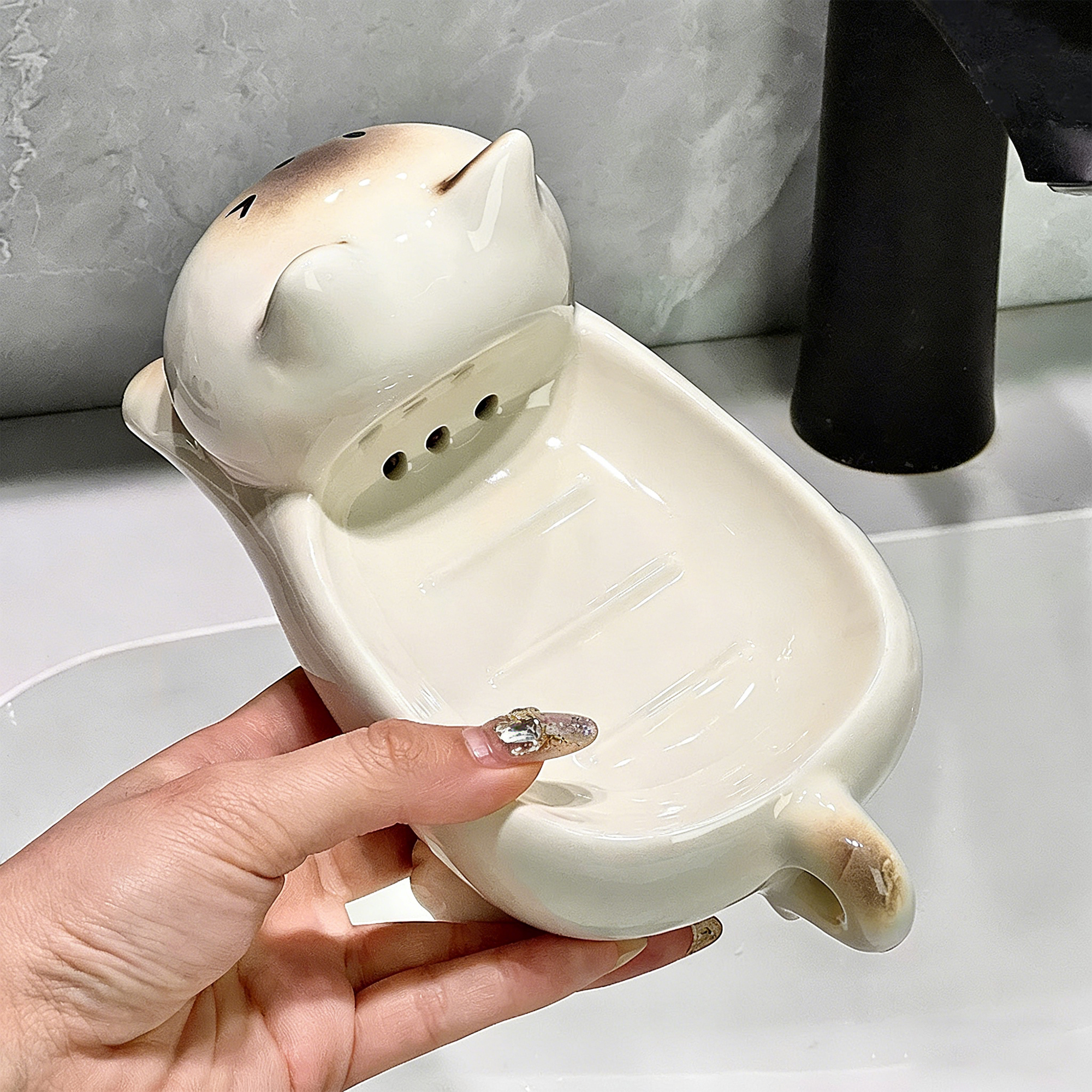 Adorable cat-shaped ceramic soap dish with self-draining design.