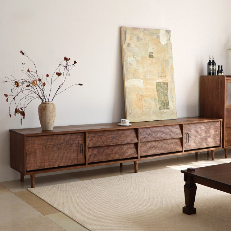 Embrace vintage elegance with this TV cabinet crafted from high-standard old North Chinese elm. It showcases the wood’s natural beauty, including authentic knots and textures. Built using traditional mortise and tenon craftsmanship, the structure is exceptionally stable and supports heavy loads without wobbling. It features functional storage with solid wood drawer slides and sliding doors for a clean, organized look. Coated in a low-odor, eco-friendly lacquer, the surface is wear-resistant and easy to maintain, making it a perfect blend of artistic “mid-century” style and modern durability.
