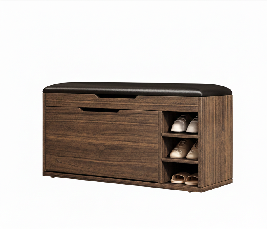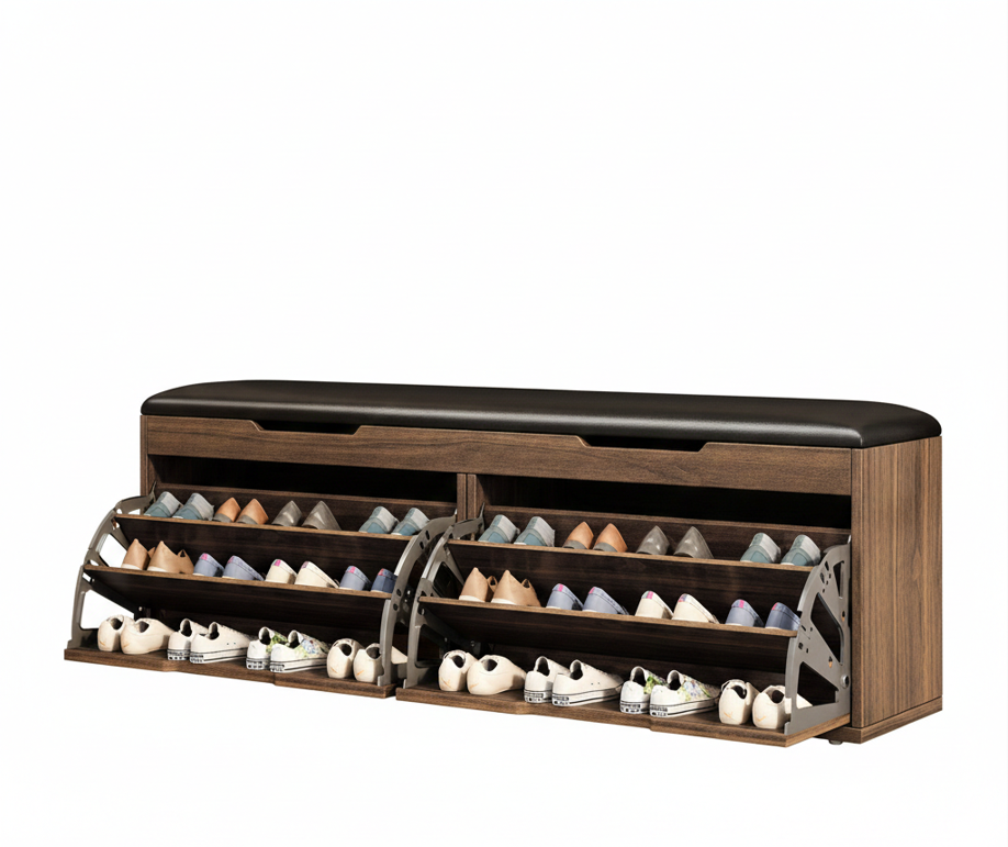 This eco-friendly solid wood shoe storage bench features a comfortable leather-padded seat, adjustable internal tiers, and a flip-drawer design, offering a stylish, space-saving solution for organized entryways.