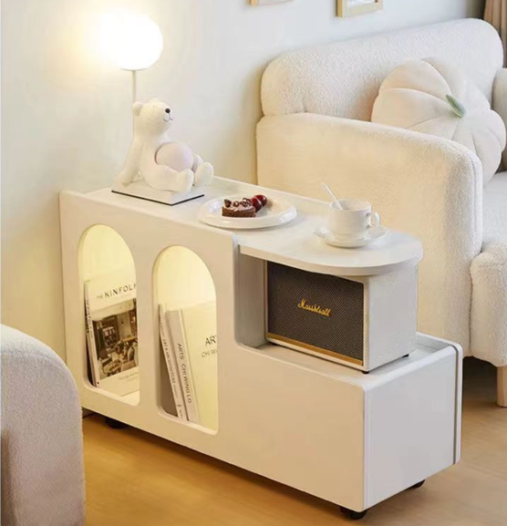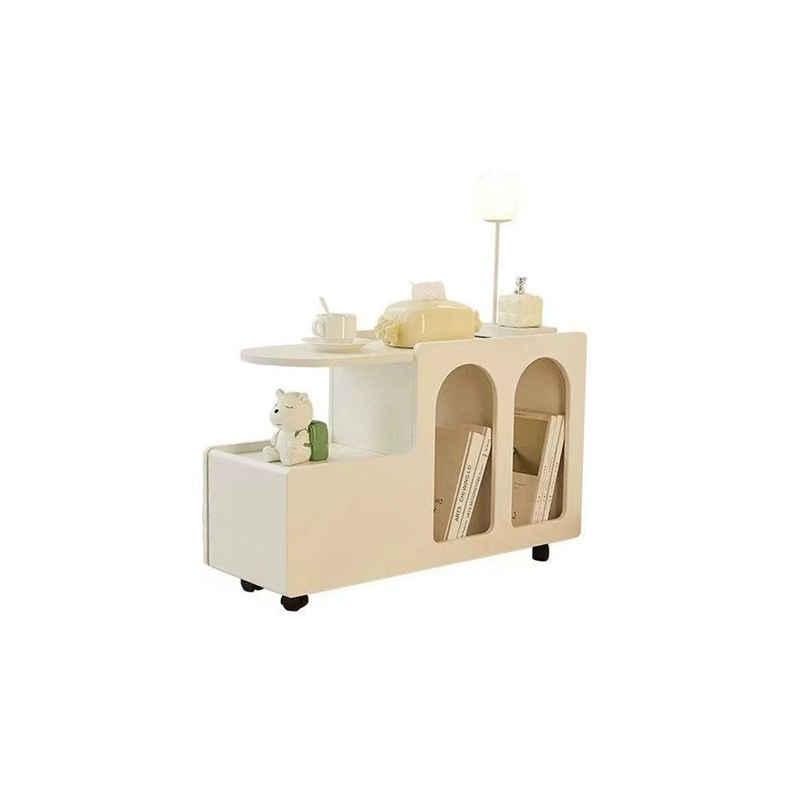 This cream-style mobile side table features arched storage niches, a sliding drawer, and lockable wheels, blending sweet aesthetics with flexible storage for cozy living spaces.