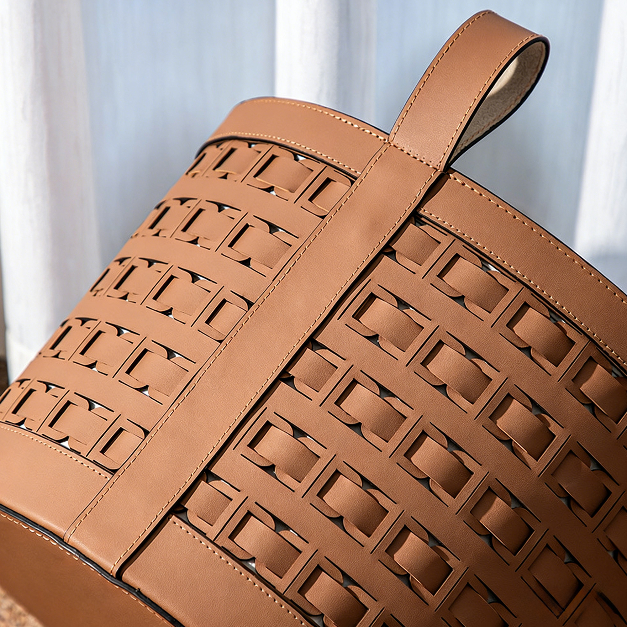 A stylish leather basket with a geometric lattice design and convenient handles.