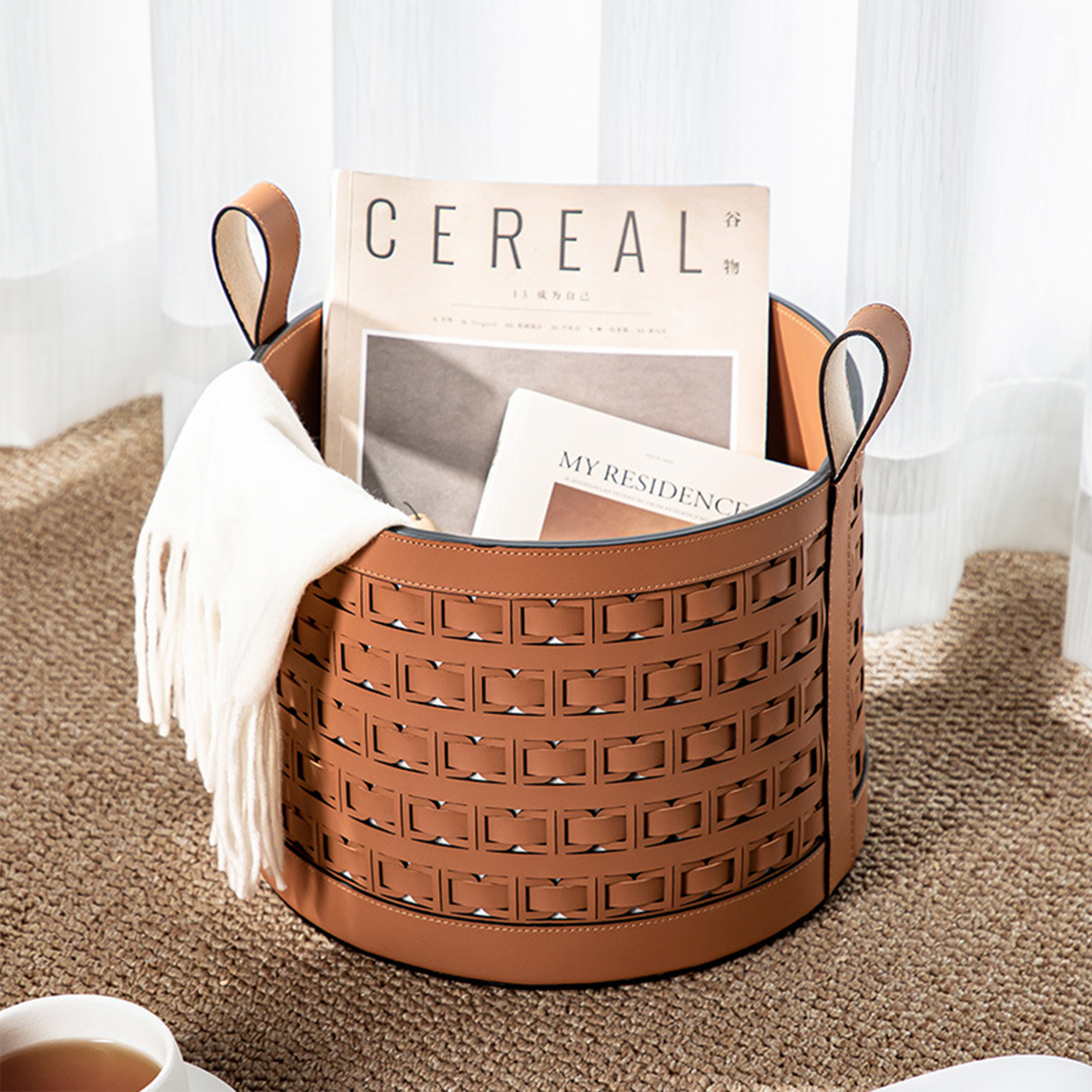 This round storage basket features an intricate openwork lattice pattern on smooth leather, available in black, brown, and gray. It measures 28×28.5cm, with two handles for easy portability, ideal for organizing magazines, blankets, and home essentials with modern elegance.