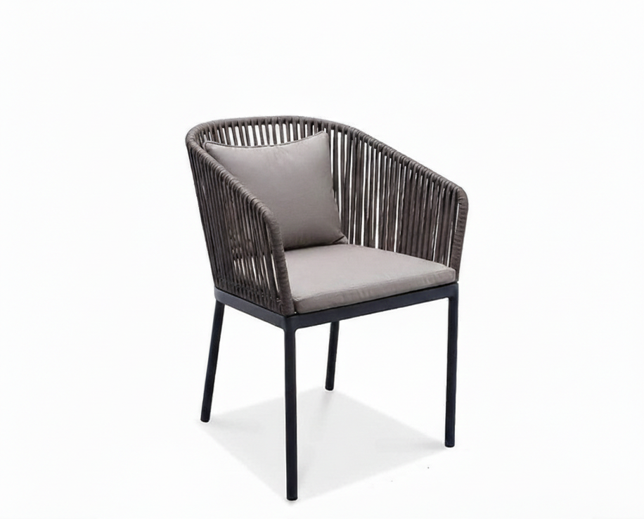 An elegant S-model outdoor armchair featuring a modern black aluminum frame, intricate hand-woven rope vertical detailing, and comfortable weather-resistant cushions. Perfect for stylish patio or balcony dining