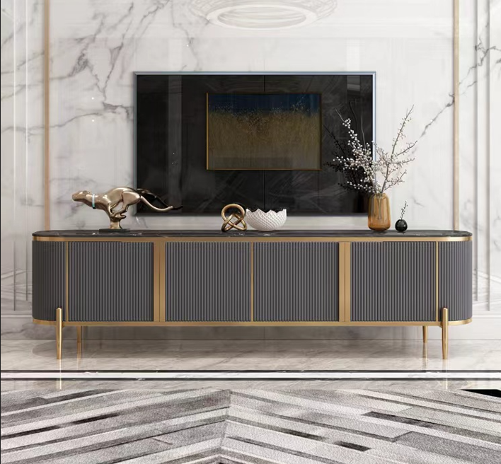 This premium TV stand embodies “light luxury” with its sophisticated mix of textures and materials. It features a sleek, fluted grey exterior framed by brushed gold electroplated stainless steel for a timeless aesthetic. The surface is crafted from high-quality marble, offering heat and scratch resistance. Built with eco-friendly E1 density board and finished with odorless water-based paint, the unit ensures a healthy home environment. Its elevated gold legs provide stability and a spacious feel, making it a perfect centerpiece for contemporary living rooms.
