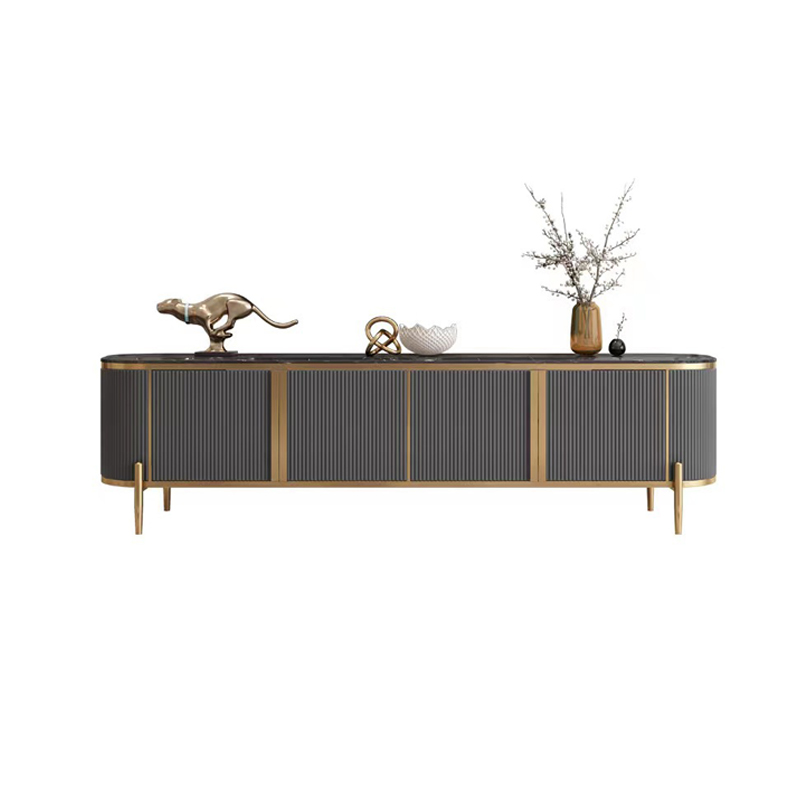 A luxury Italian-style TV console featuring a fluted charcoal grey body, gold stainless steel accents, and a customizable marble top. It blends modern elegance with functional large-capacity storage.