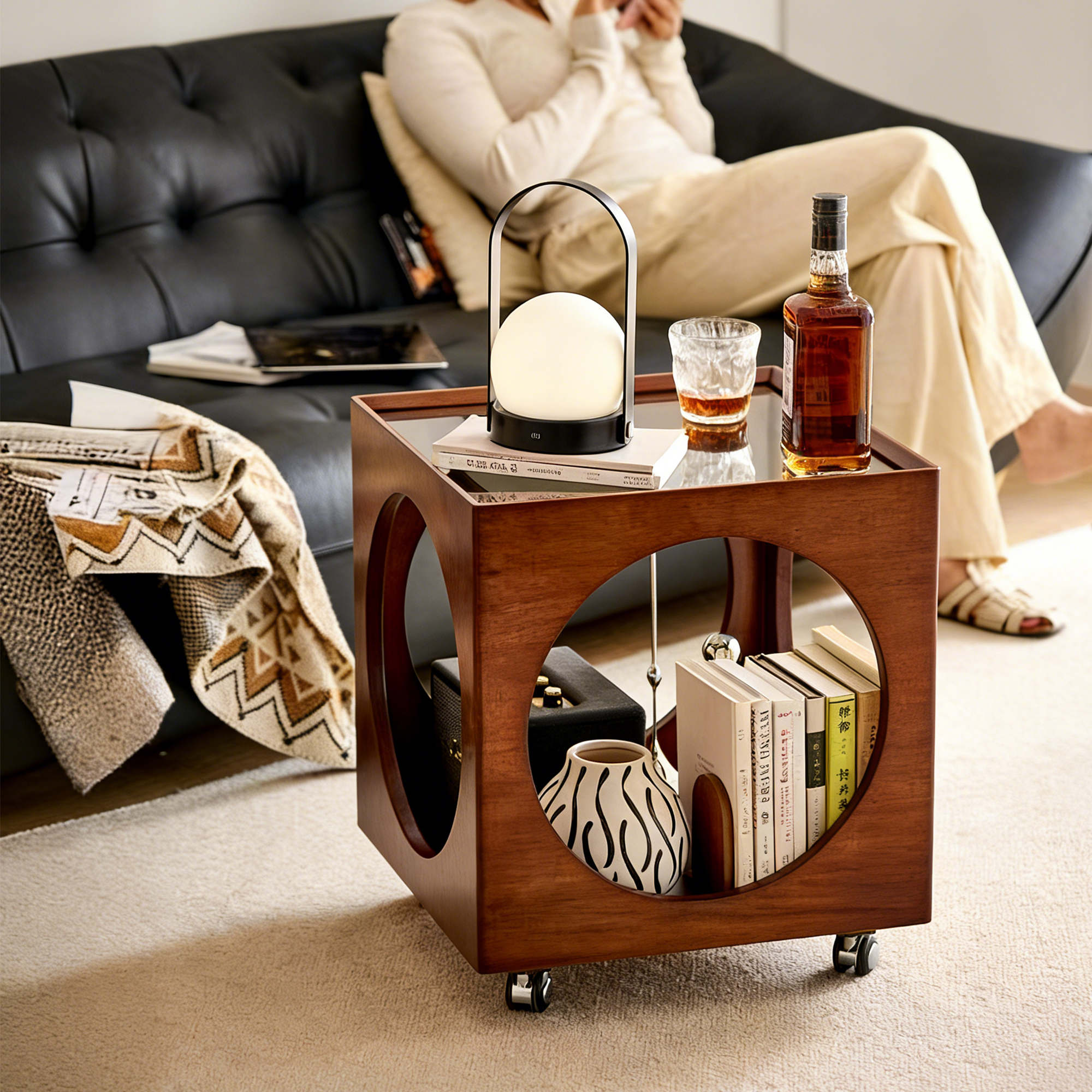 This 40×40×52cm mobile side table is crafted from solid rubberwood with a tempered glass top. It features circular cutouts for easy access to internal storage, which can also double as a cozy cat bed. Equipped with 360° casters, it’s ideal for living rooms, bedrooms, and home offices.