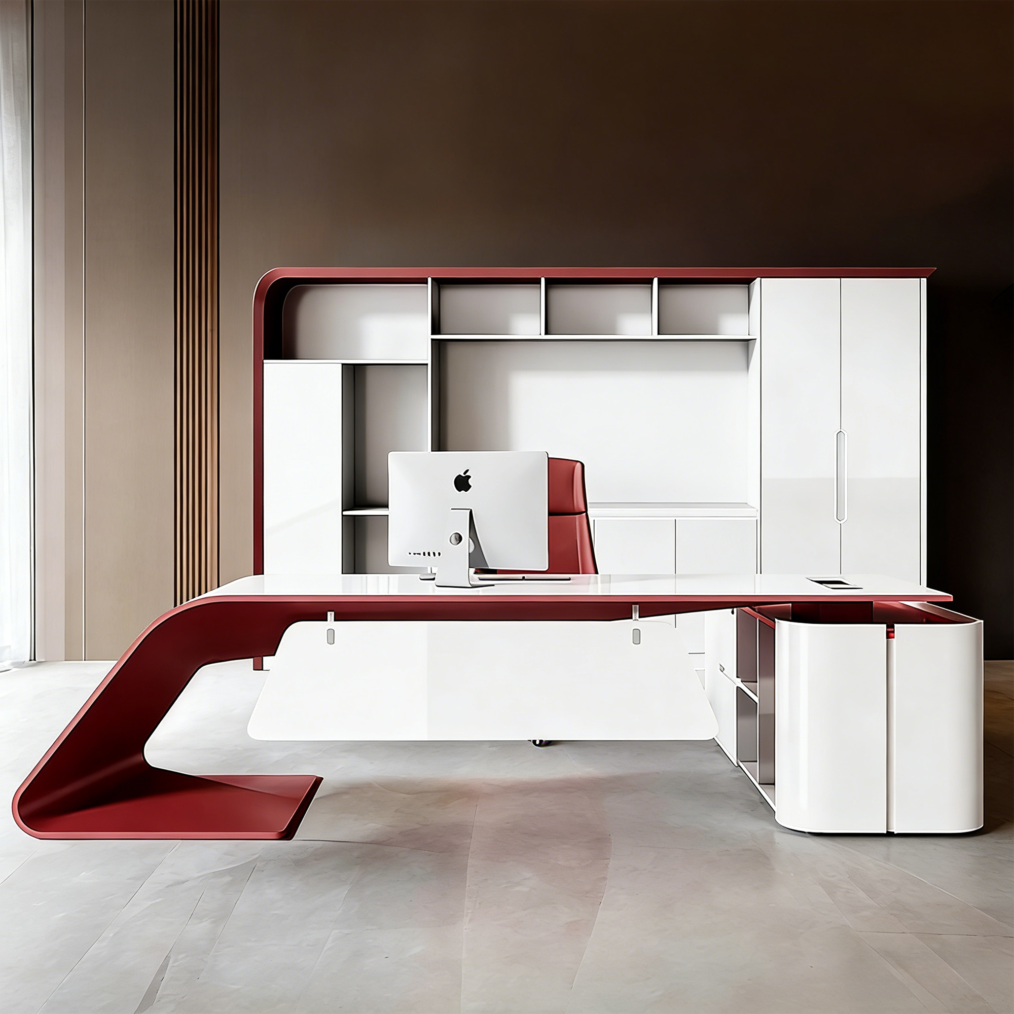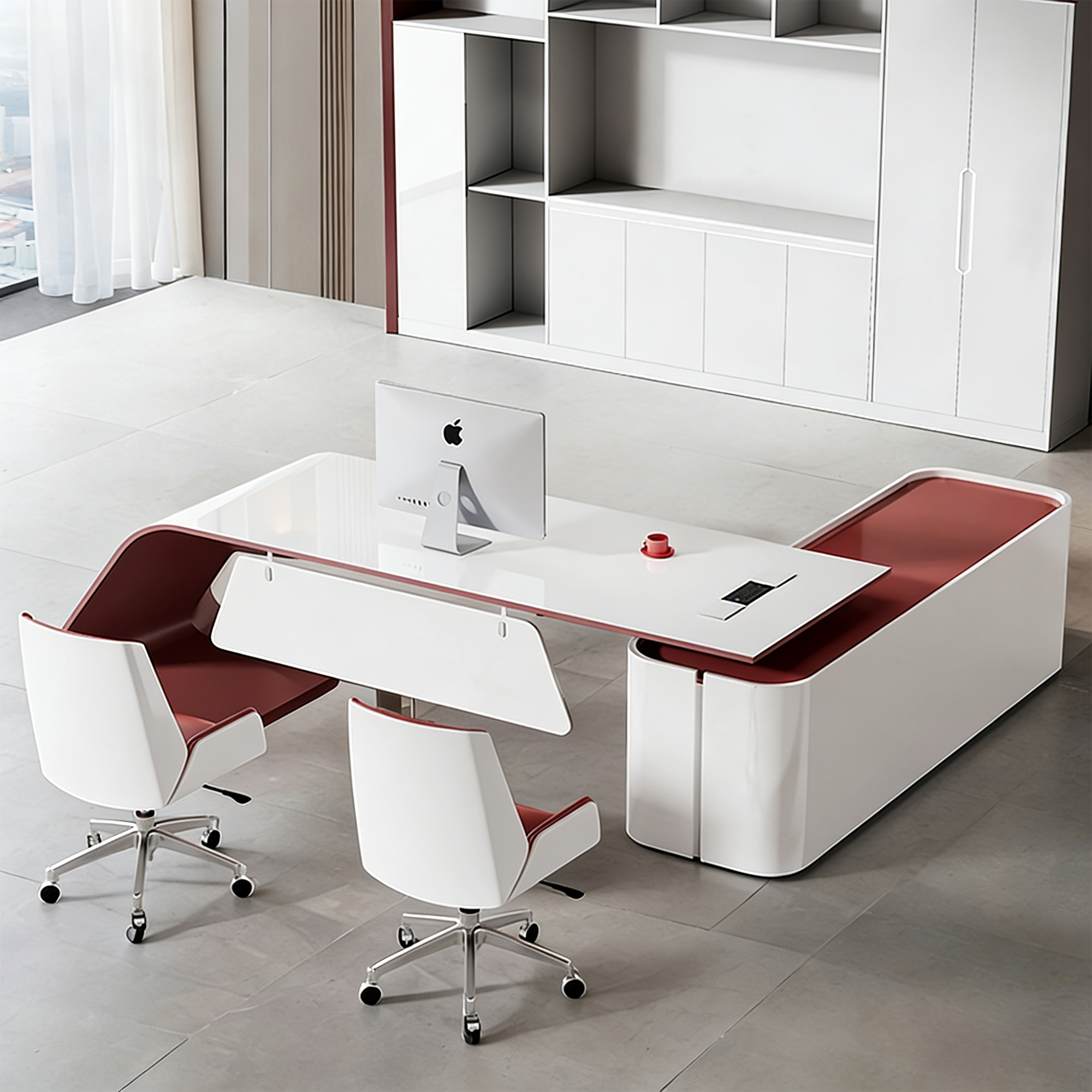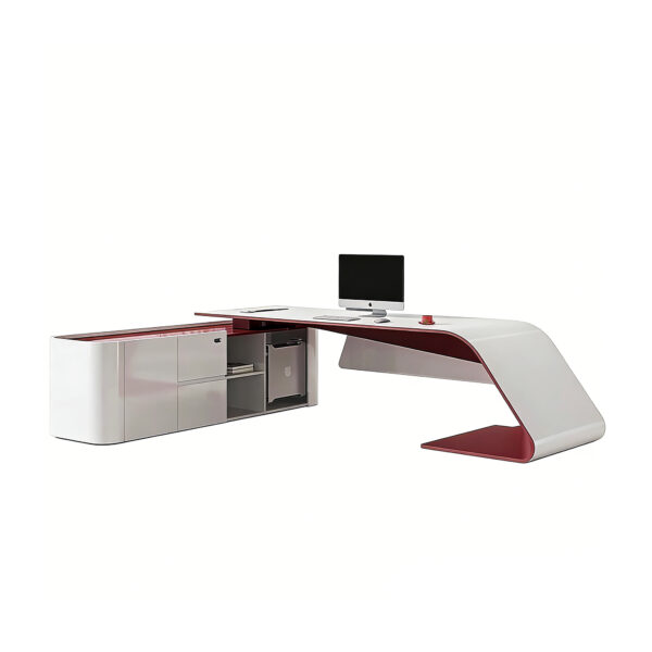 This contemporary executive desk features a striking white and burgundy high-gloss finish using Italian 4C piano baking technology. It includes a privacy front baffle, stable fiberglass curved legs, and a matching storage cabinet, offering durability, scratch resistance, and a modern office aesthetic.