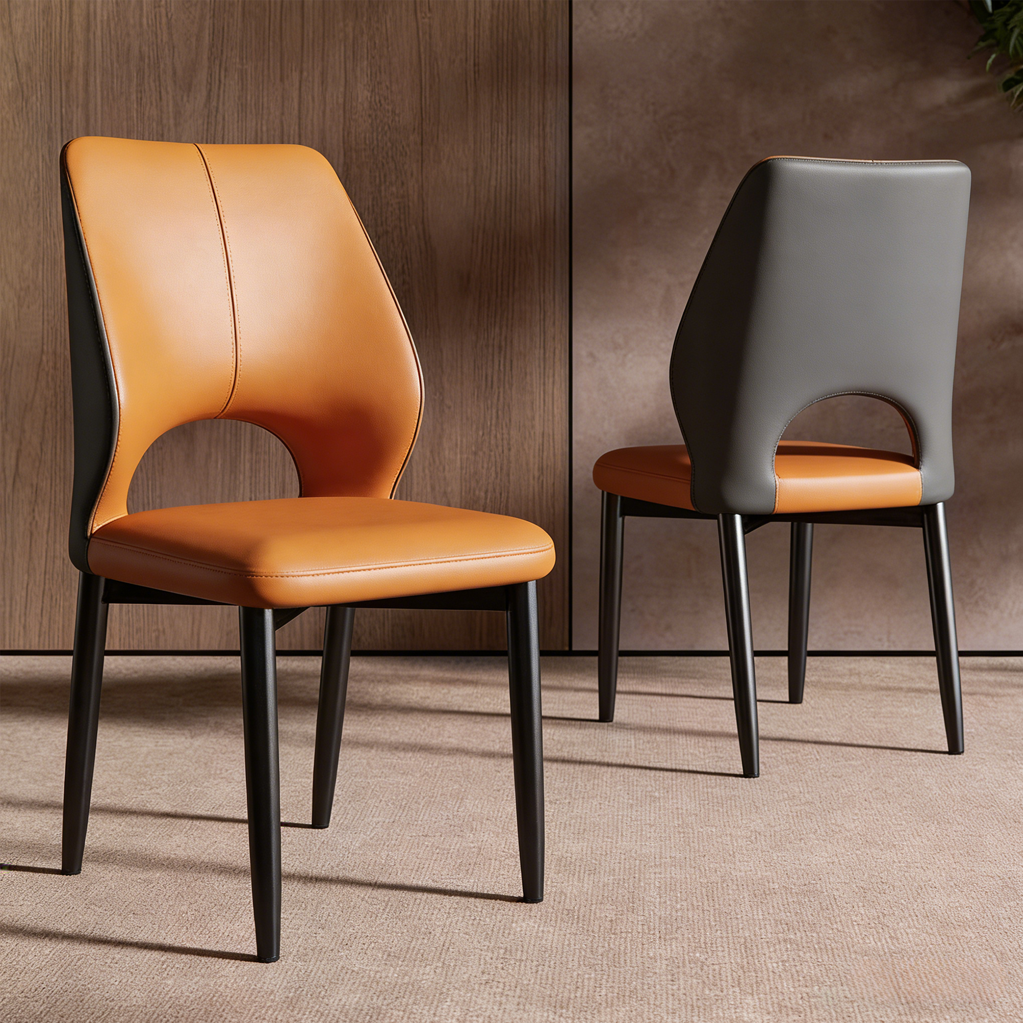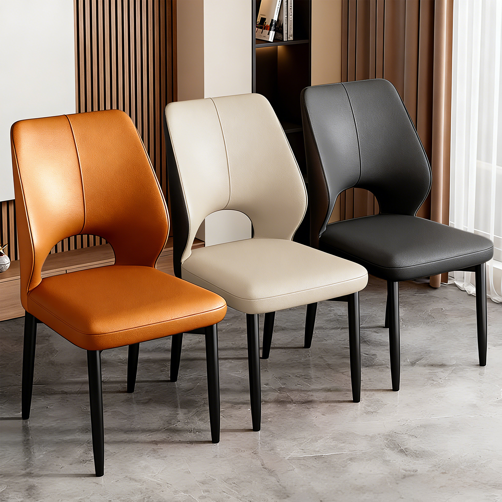 This modern dining chair features a skin-friendly PU leather surface, high-density rebound sponge padding, and an ergonomic hollow backrest for lumbar support. Its sturdy carbon steel legs with anti-slip feet ensure stability, while its compact design allows it to tuck under tables to save space. Available in multiple colors.