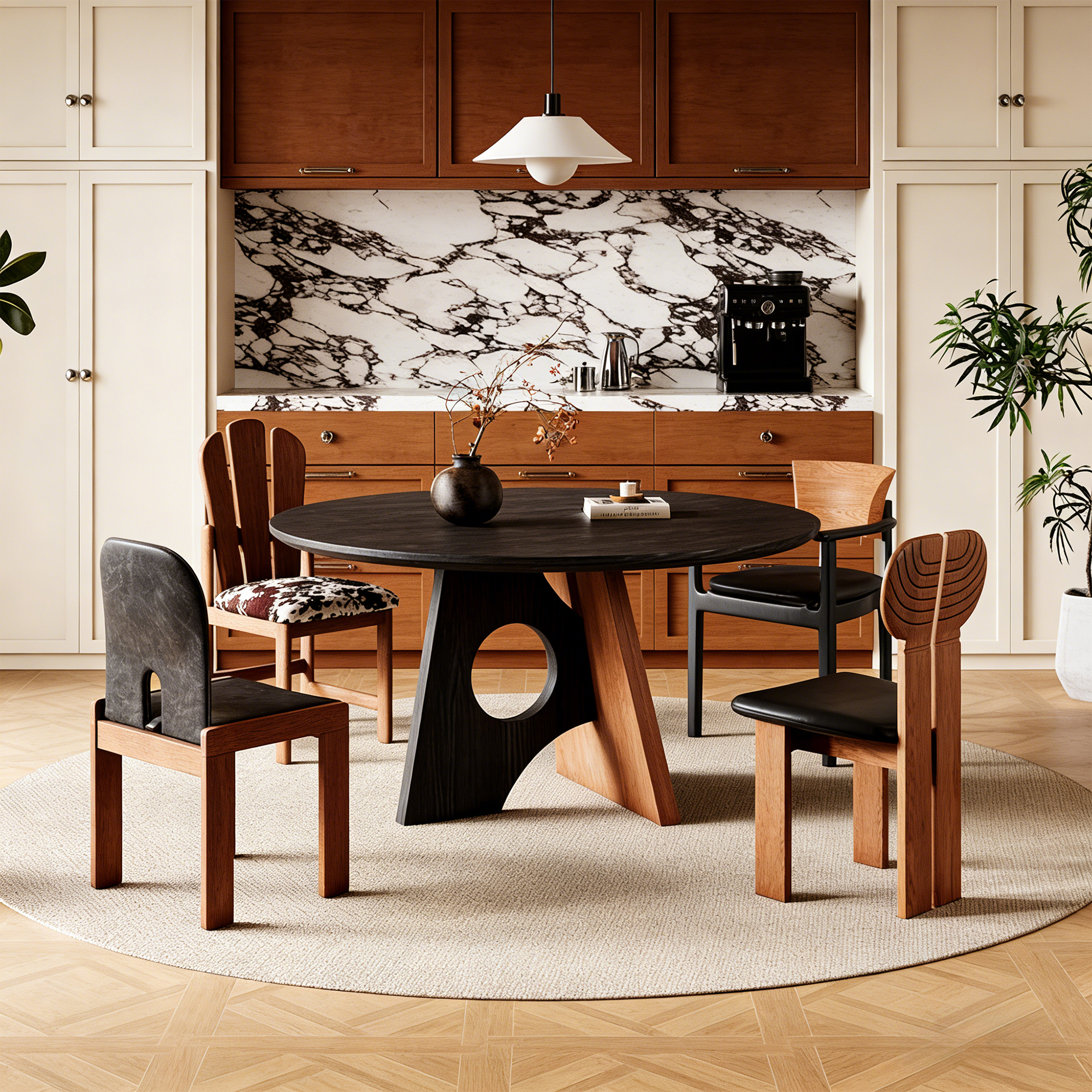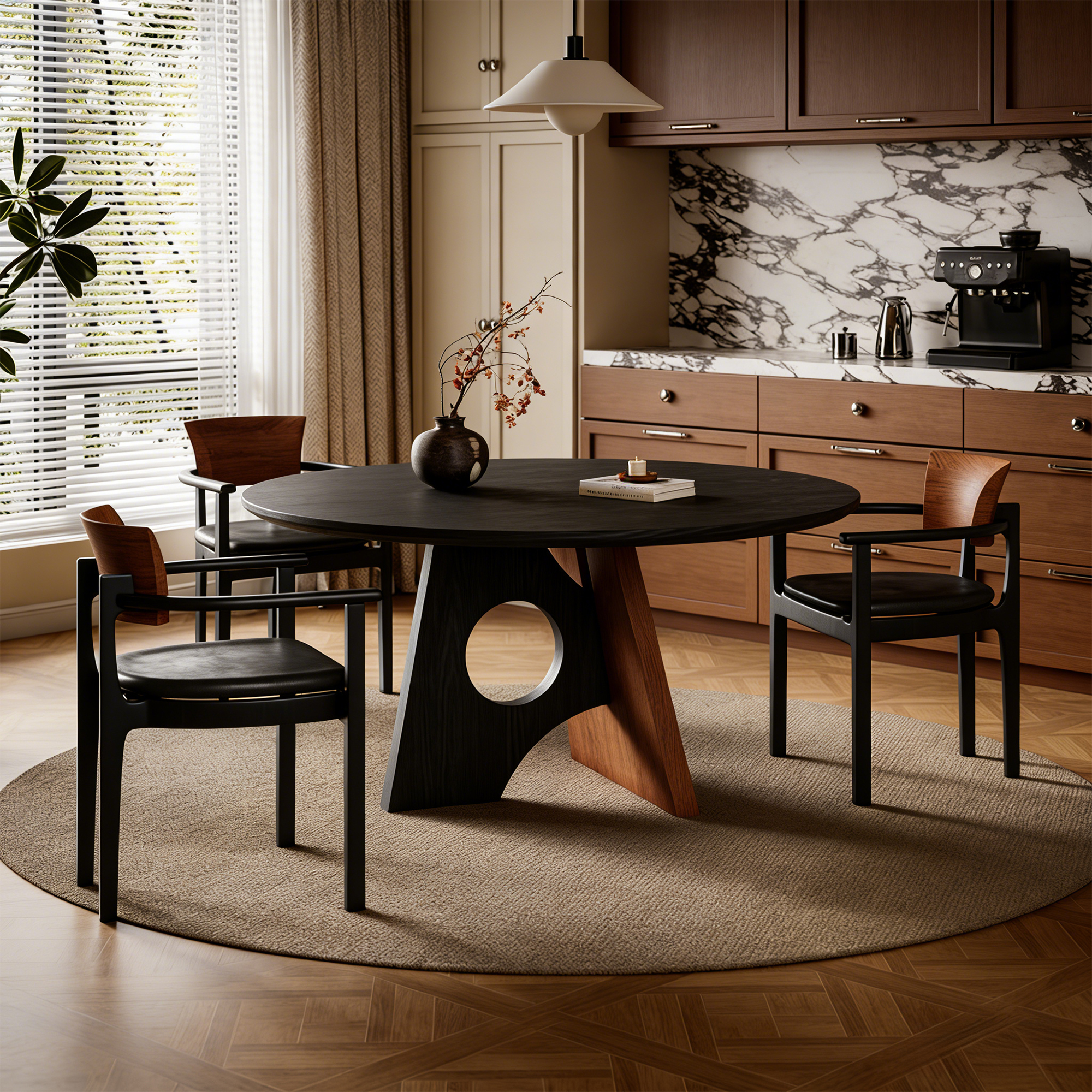 This contemporary round dining table features a dark wood tabletop supported by a striking A-frame base, combining a dark wood leg with a circular cutout and a contrasting light wood leg. The dual-tone design adds visual interest, making it a stylish centerpiece for modern dining spaces.