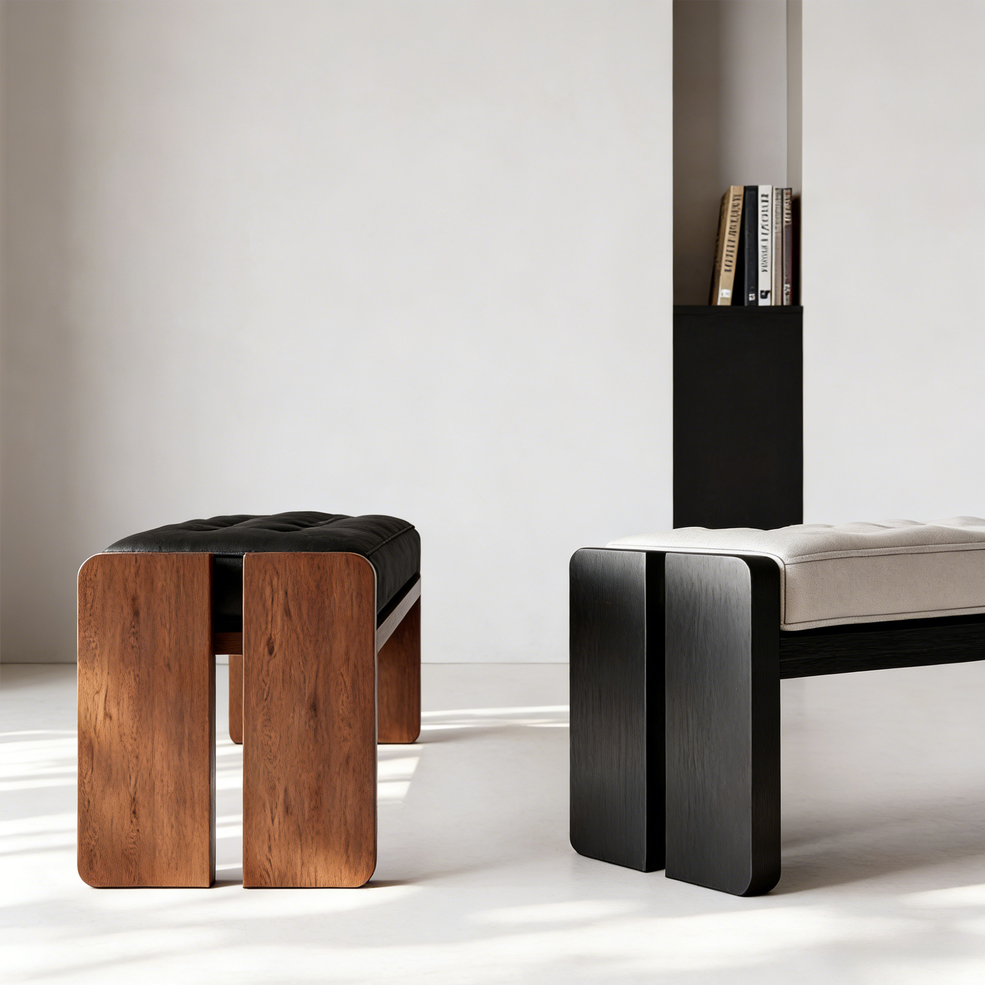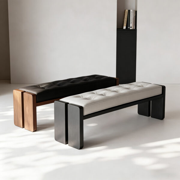 This contemporary bench features a tufted leather seat, available in black, white, and green, supported by a sturdy solid wood frame. The frame is offered in natural wood or black finishes, with thick, sculpted legs for a bold, minimalist aesthetic. Ideal for entryways, living rooms, or at the foot of a bed, it blends comfort with modern design.