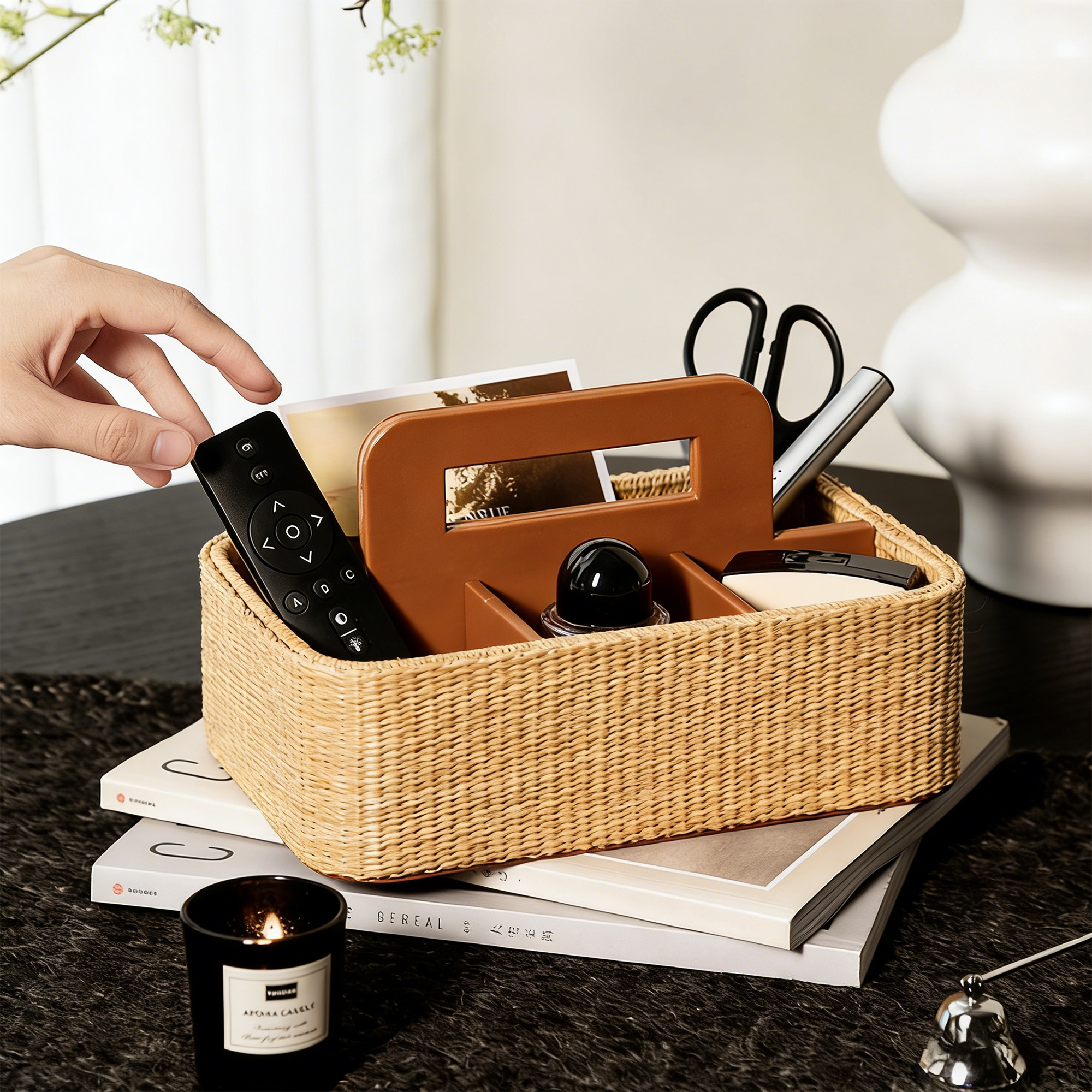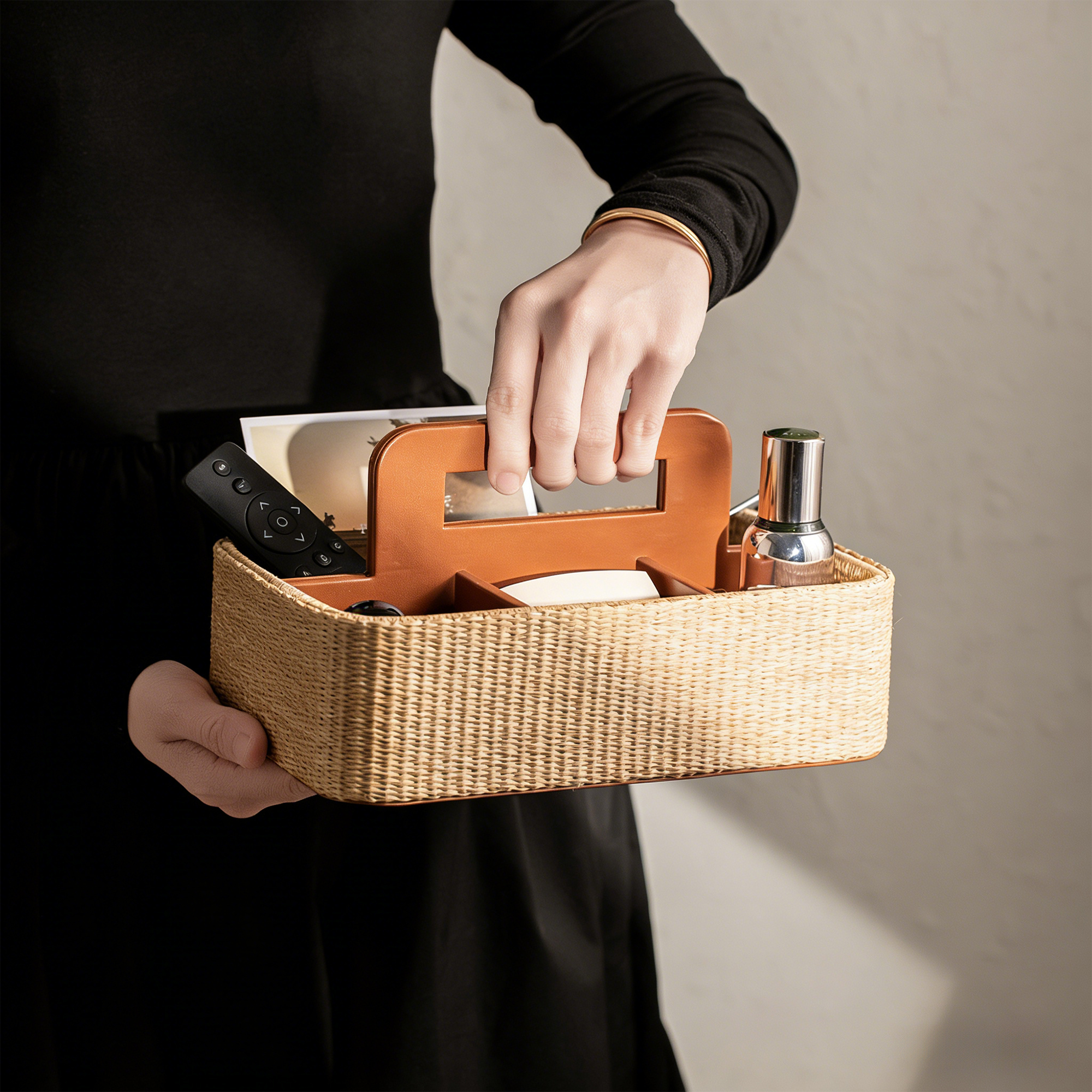 This 25.5×16×8.5cm storage caddy features a natural rattan weave with a brown leather handle and internal dividers. It creates multiple compartments to organize remotes, cosmetics, and small items, blending rustic texture with modern functionality for home use.