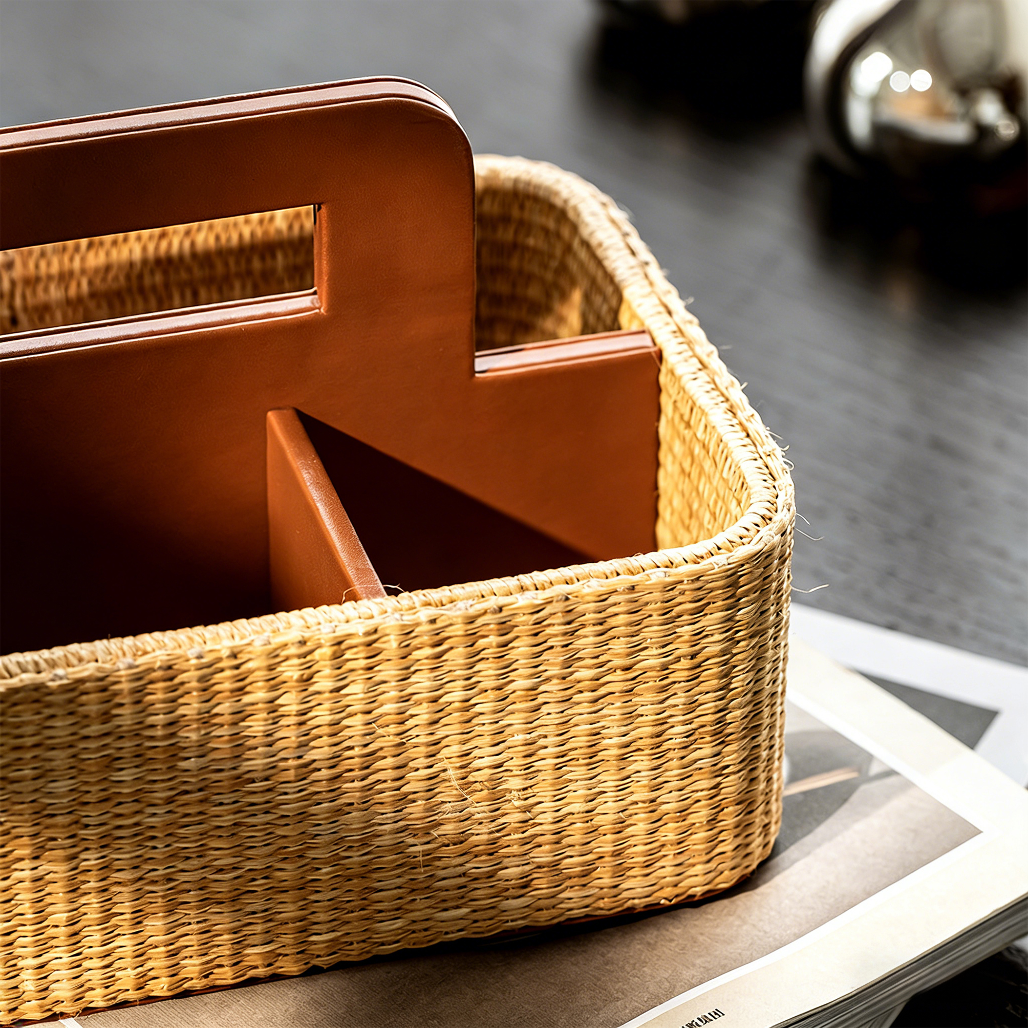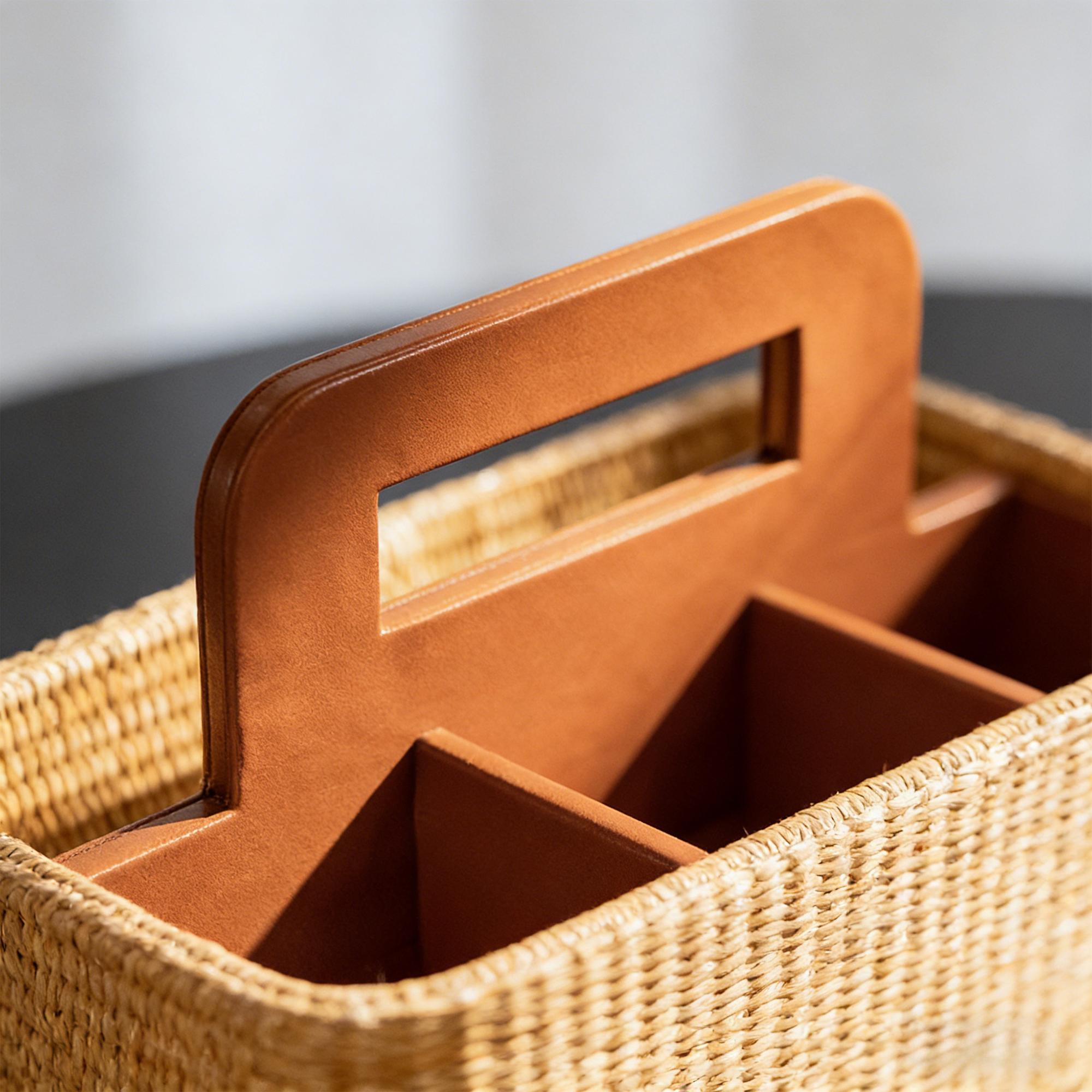 A portable rattan caddy with leather dividers for organized storage.