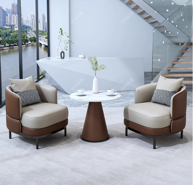 This Nordic-inspired set is designed for versatility in sales offices, hotels, or home settings. It features a 70cm round table with a 12mm thickened, high-load-bearing top and a stable 500mm carbon steel base. The two matching chairs feature an ergonomic curved backrest and are upholstered in premium, breathable cat-scratch resistant leather. Each chair is filled with collapse-resistant high-density sponge and supported by reinforced carbon steel legs with anti-scratch foot pads for rock-solid stability.