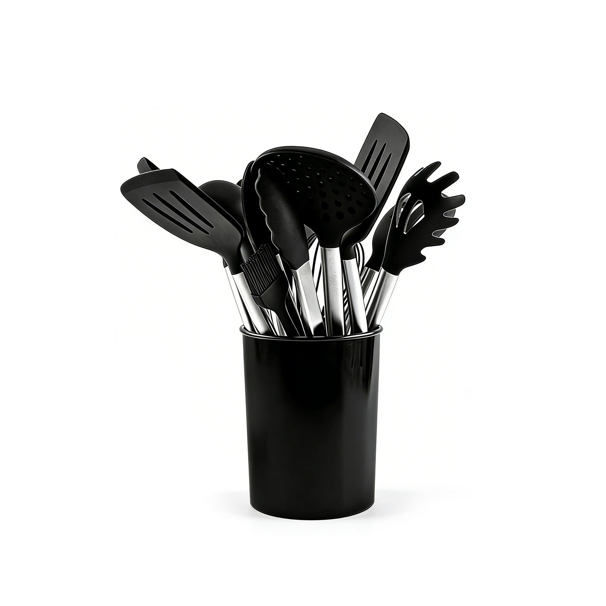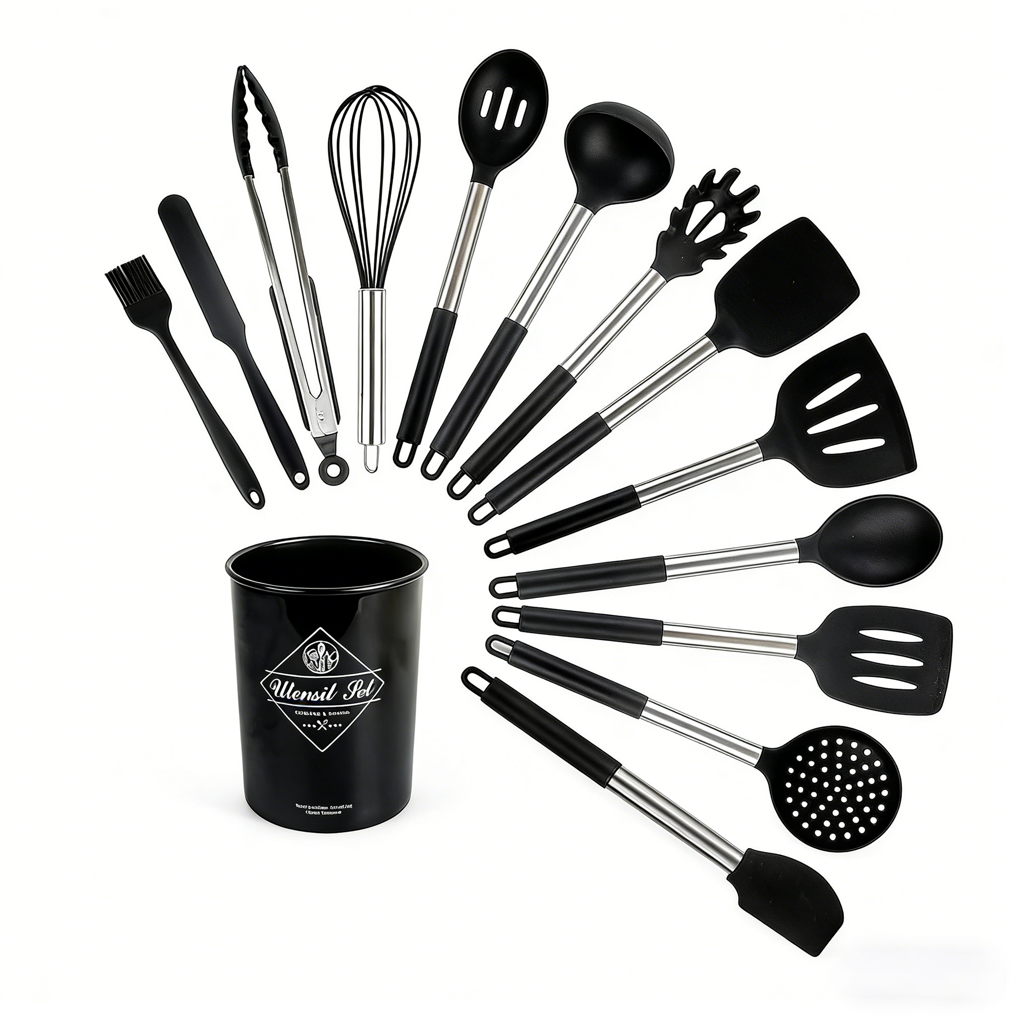 This comprehensive 13-piece kitchen utensil set is designed for versatility and durability. Crafted with food-safe silicone heads and high-quality handles, the set includes essential tools like spatulas, ladles, tongs, a whisk, and pasta servers. The heat-resistant silicone protects your non-stick cookware from scratches. The set comes with a matching storage container for organized, space-saving countertop display. Perfect for both cooking and baking, these utensils are practical, easy to clean, and essential for any modern kitchen.