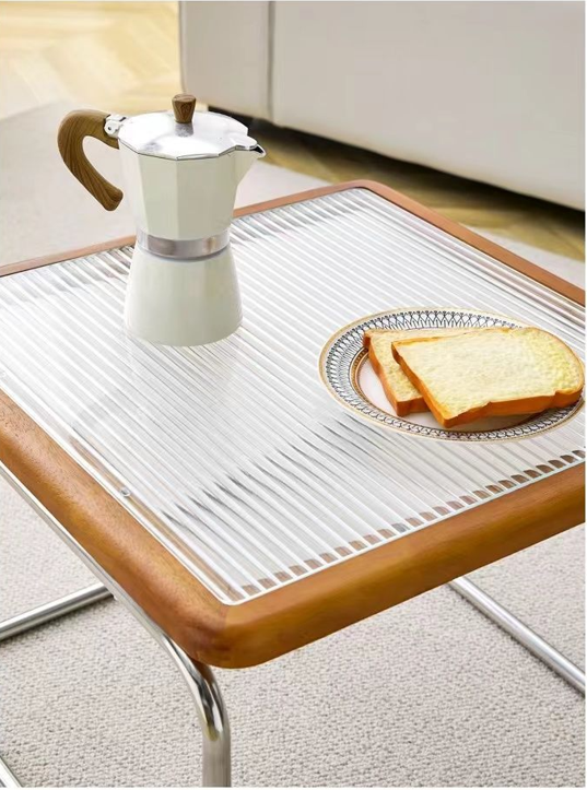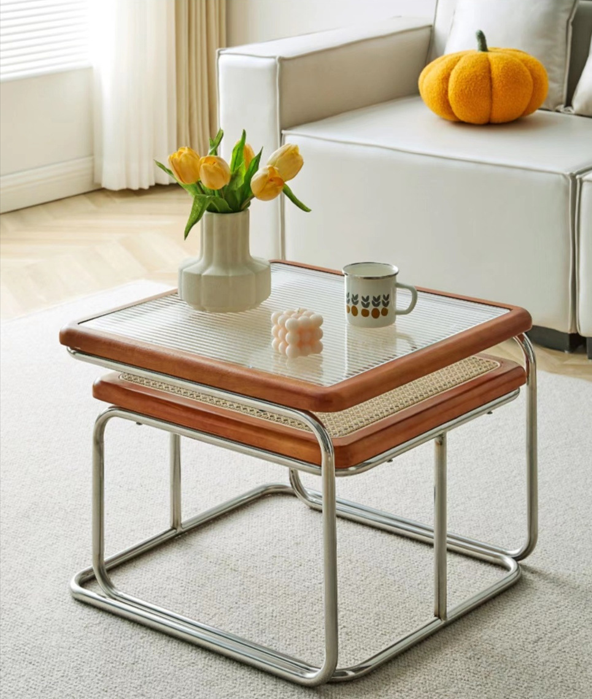 This versatile nesting coffee table set combines mid-century modern aesthetics with high-quality materials. It features two pieces: a taller table with a ribbed glass top and a smaller one with hand-woven Indonesian rattan. The frames are crafted from premium North American FAS-grade solid wood with smooth, rounded corners for safety. Supported by a minimalist “C-shaped” stainless steel frame, the tables can be used separately as side tables or nested together to save space, offering a functional and artistic touch to any living room or bedroom.
