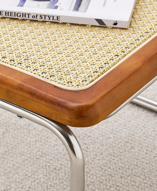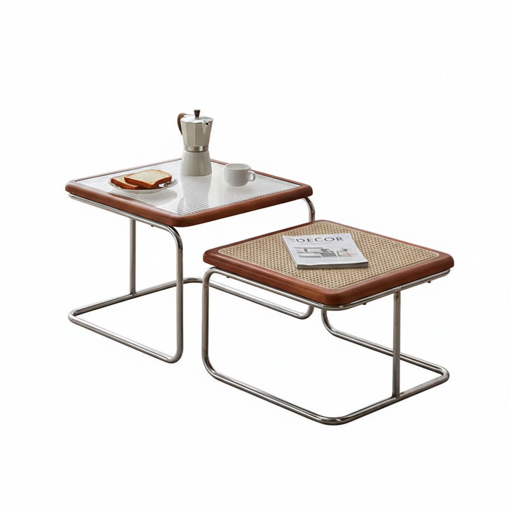 A stylish nesting coffee table set featuring North American FAS-grade solid wood frames, natural Indonesian rattan, and elegant ribbed glass tops supported by a sleek stainless steel base.