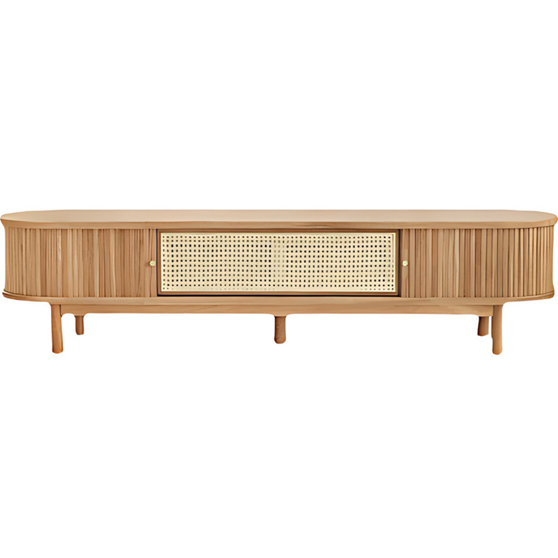 Embrace “Functional Aesthetics” with this Nordic minimalist TV stand. Crafted from high-quality imported wood with a soft log finish, it features a unique combination of vertical slat doors and natural Indonesian rattan weaving. The oval, streamlined silhouette offers a “less is more” luxury, while the interior provides versatile storage to keep spaces organized. Its breathable rattan panels and sturdy frame balance organic texture with durability. Ideal for living rooms or hotel suites, this piece brings a healing, nature-inspired atmosphere to your home.