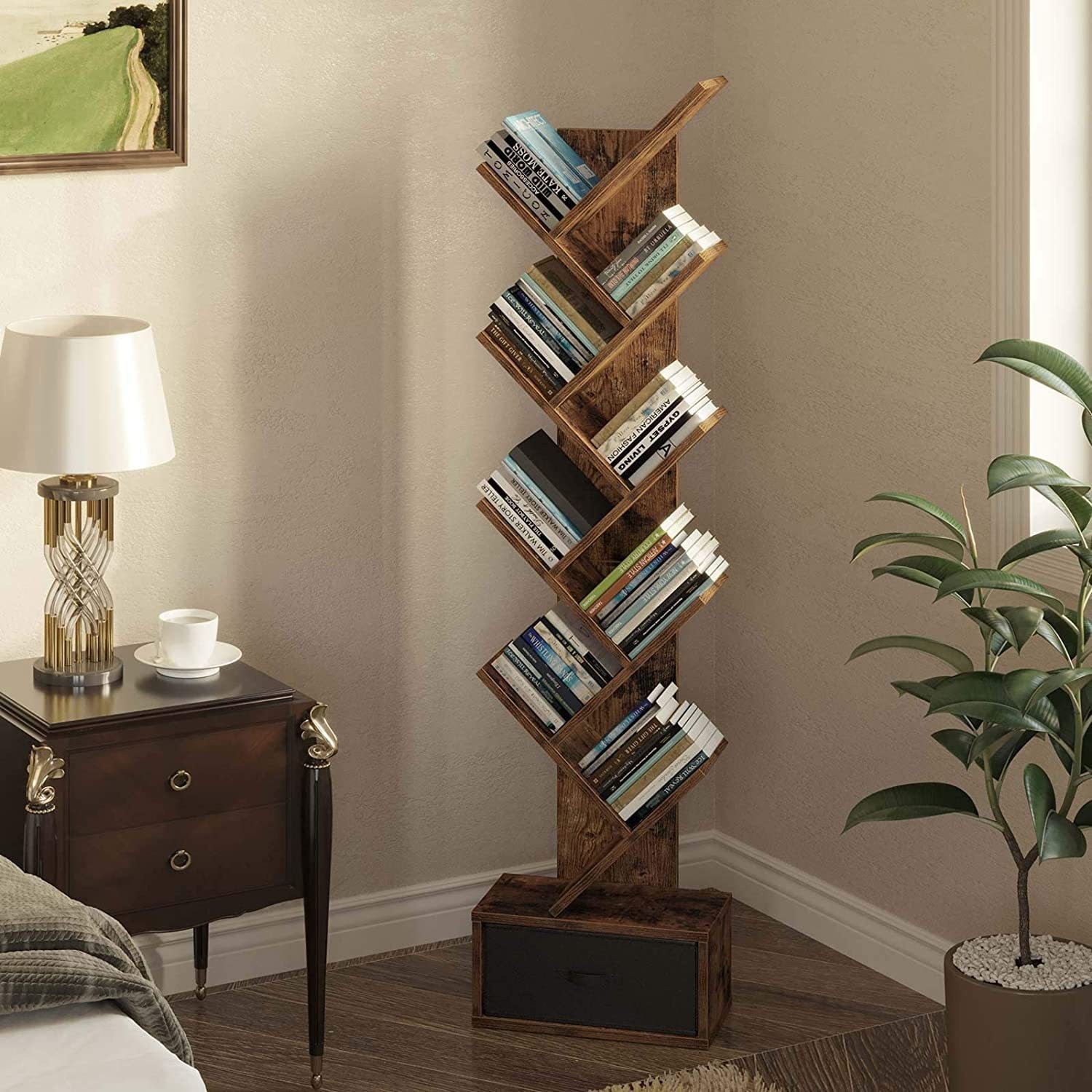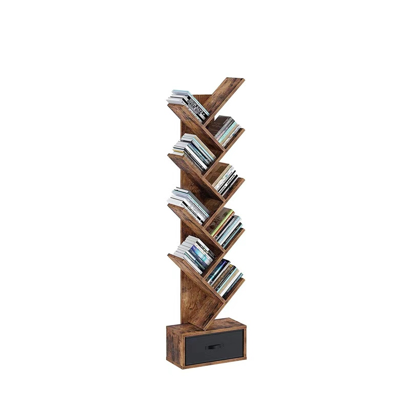 Elevate your home library with this uniquely designed tree bookshelf. Its vertical, staggered branch design maximizes storage while occupying minimal floor space, making it ideal for narrow corners. Crafted with a rustic wood finish, it includes a base leather and non-woven fabric drawer for discreet storage of small essentials. Safety is prioritized with an integrated anti-toppling kit and non-slip pads to protect your floors. Combining stability with a modern industrial aesthetic, this bookcase is the perfect functional statement piece for any bedroom, office, or living room.
