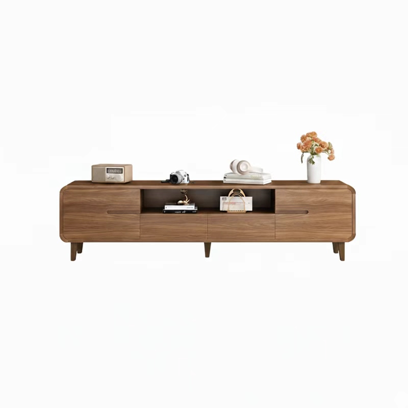 This stylish TV stand blends modern functionality with a cozy, minimalist aesthetic. Crafted with a durable walnut-grain finish and solid rubberwood legs, it stands at an ergonomic height of 45cm. The design prioritizes safety with smooth, rounded corners and integrated recessed handles to prevent bumps. For organization, it features a diversified storage system including two open central compartments—ideal for routers and media devices—and multiple spacious drawers. The open-back design ensures effortless cable management, allowing the unit to sit flush against the wall while keeping wires organized and out of sight.