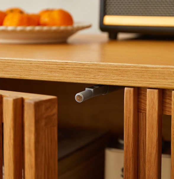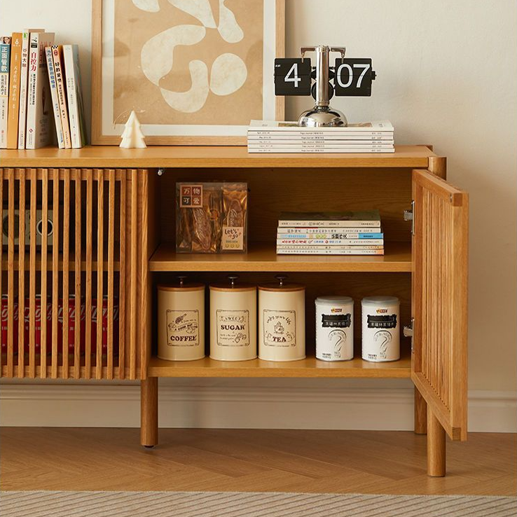 Elevate your living space with this sophisticated sideboard, meticulously crafted from North American FAS-grade oak. The piece features a distinctive slatted door design that provides a minimalist aesthetic while ensuring ventilation for electronics. Practicality meets modern engineering with push-to-open doors, soft-close hinges, and built-in cable management ports. The spacious interior includes three-level adjustable shelves to accommodate various items. Supported by five sturdy legs for maximum stability, the unit is finished with an eco-friendly, four-layer open spray coating that highlights the natural wood grain while maintaining a high environmental standard.
