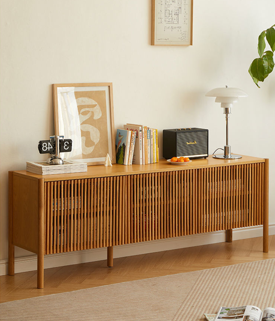 This elegant Japandi-style TV console is crafted from premium North American FAS-grade oak. It features a breathable slatted door design, push-to-open mechanics, and adjustable internal shelving for versatile storage.