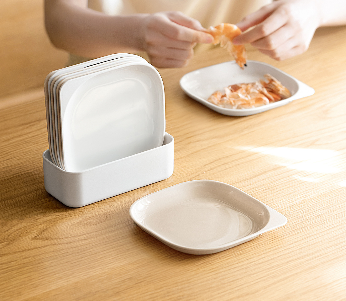 Keep your dining table clean and organized with the Tabletop Waste Plate Set. Designed for food scraps, shells, and bones, it includes a vertical caddy that neatly stores 4 or 6 plates to reduce clutter. Minimalist, practical, and perfect for a tidy dining experience.