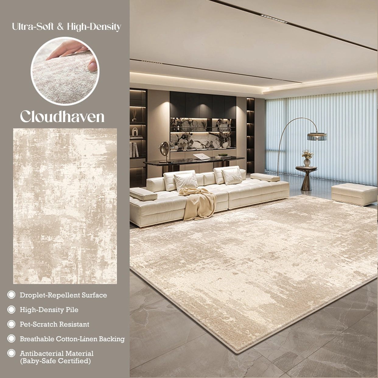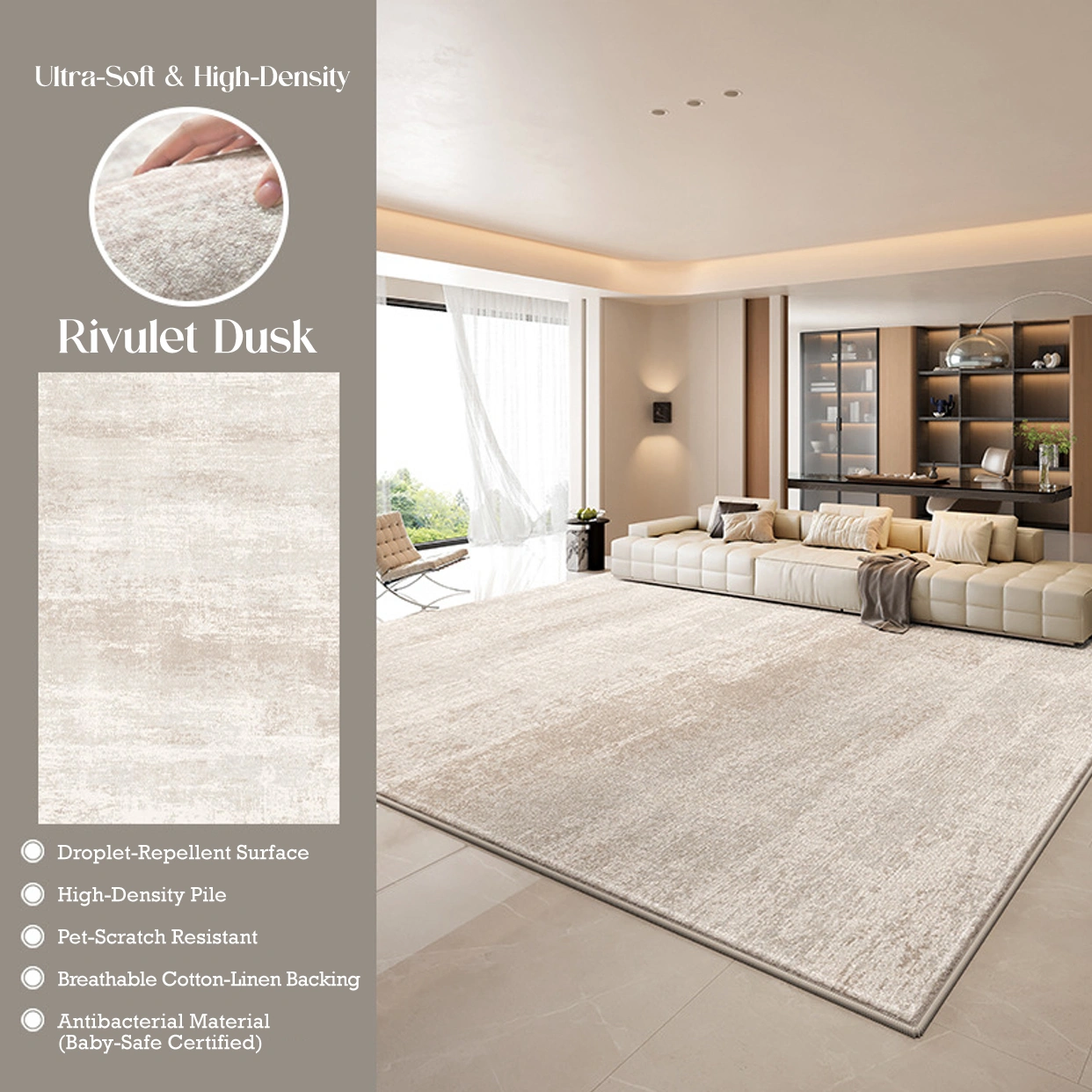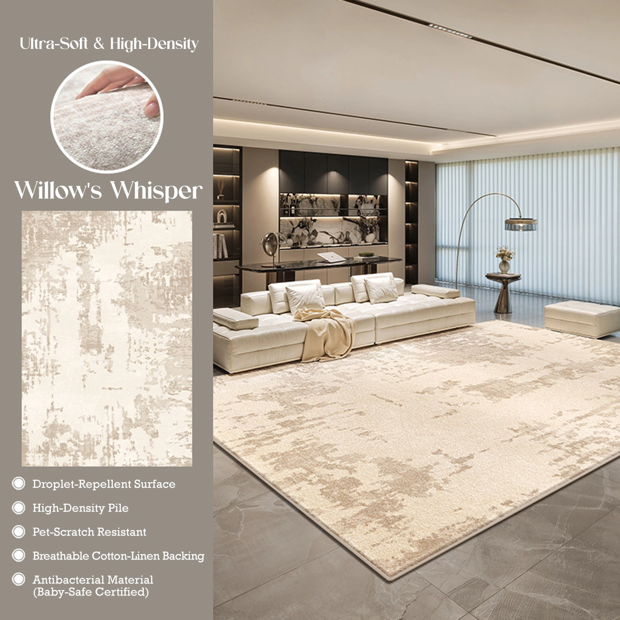 Elevate your space with the Willow Whisper Velvet Rug, where modern design meets everyday practicality. Featuring a soft, abstract pattern in calming neutral tones, it is crafted from ultra-plush faux velvet for a warm, luxurious feel. With a water-repellent surface for easy care and a breathable, non-slip backing for durability, it offers effortless comfort—perfect for busy homes, pets, and family living.