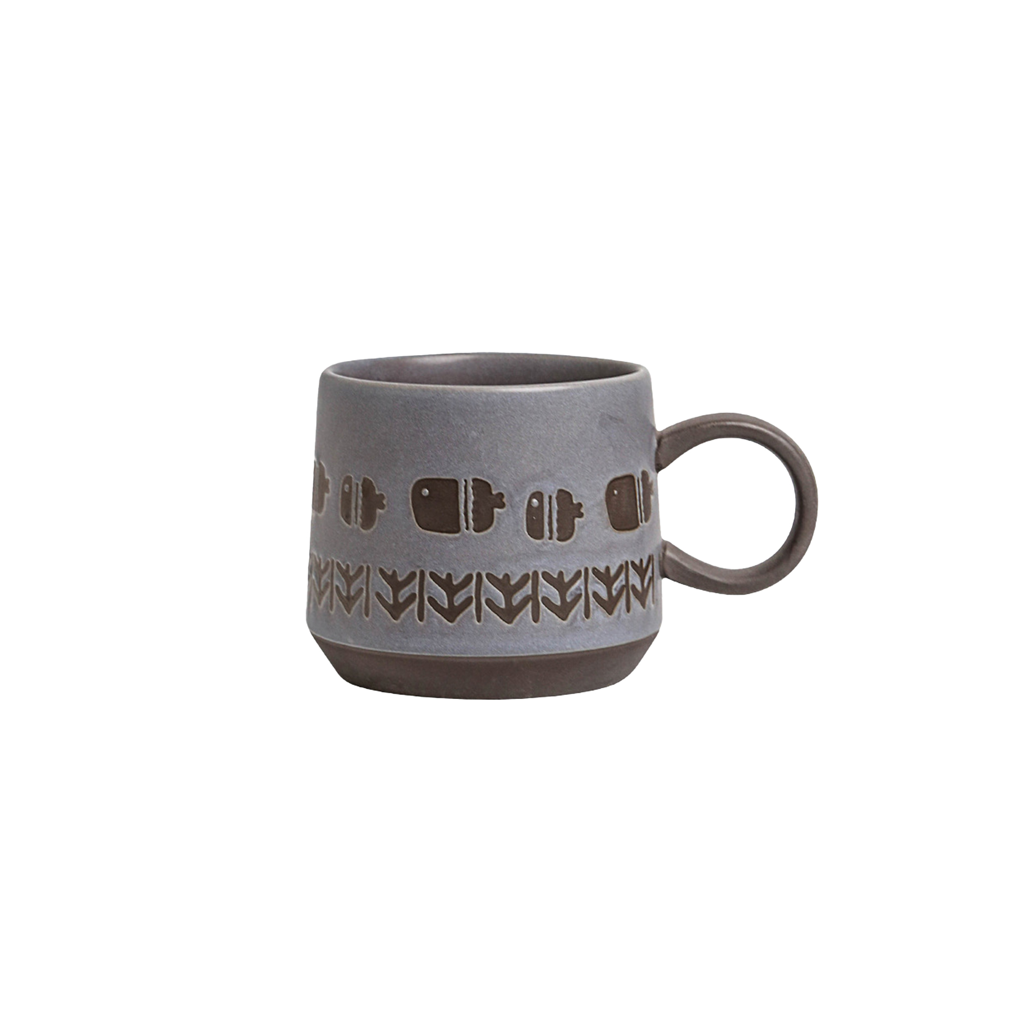 This 450ml ceramic mug features intricate retro totem engravings with fish and geometric motifs. Its matte gray-brown finish brings a sense of heritage and understated elegance.