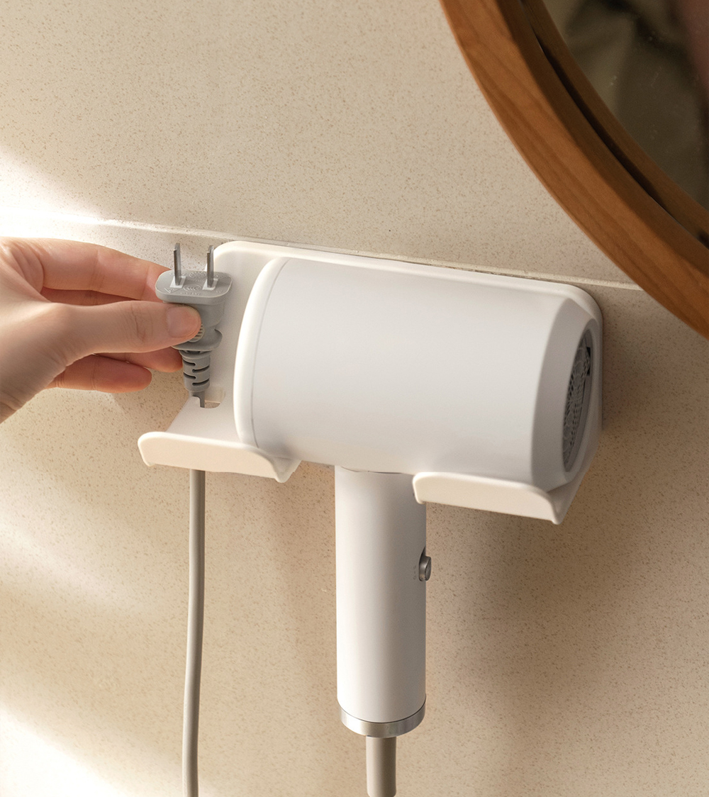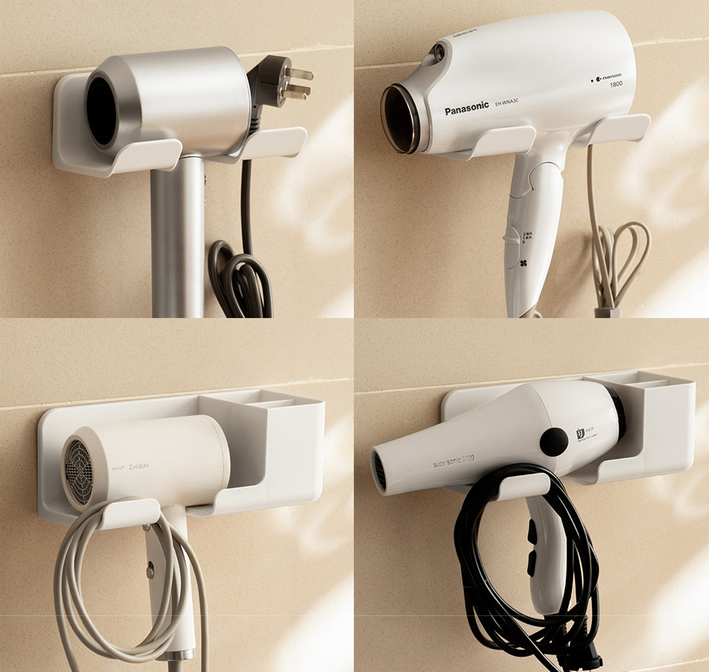 Declutter your vanity with this wall-mounted hair dryer organizer. Featuring a universal holder and built-in storage for brushes and accessories, it keeps your essentials tidy and within reach. Easy to install with damage-free adhesive for a clean, space-saving setup.