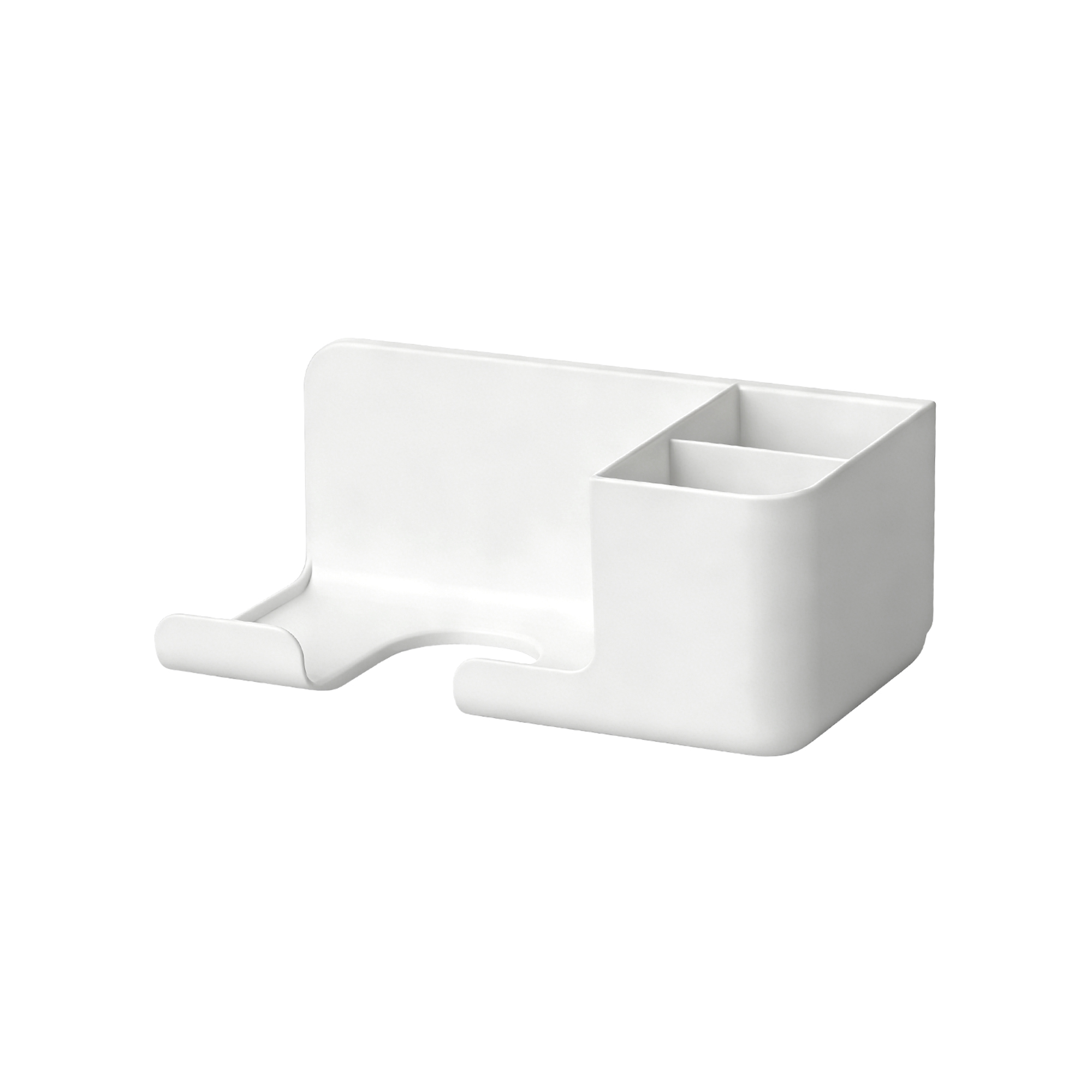 Holds your hair dryer while the side compartment stores combs, brushes, and accessories.