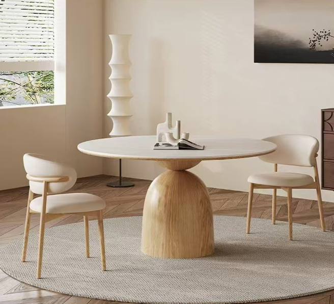 Designed for both style and functionality, this round dining table combines a sleek, high-hardness rock slab tabletop—resistant to heat, scratches, and stains—with a sculptural solid wood pedestal base. Its single-leg design maximizes legroom, allowing 360° seating for more people without obstruction, while the wide, conical base ensures exceptional stability. The minimalist aesthetic blends seamlessly with modern, Scandinavian, and Japandi interiors, making it a stylish centerpiece for family meals and gatherings.