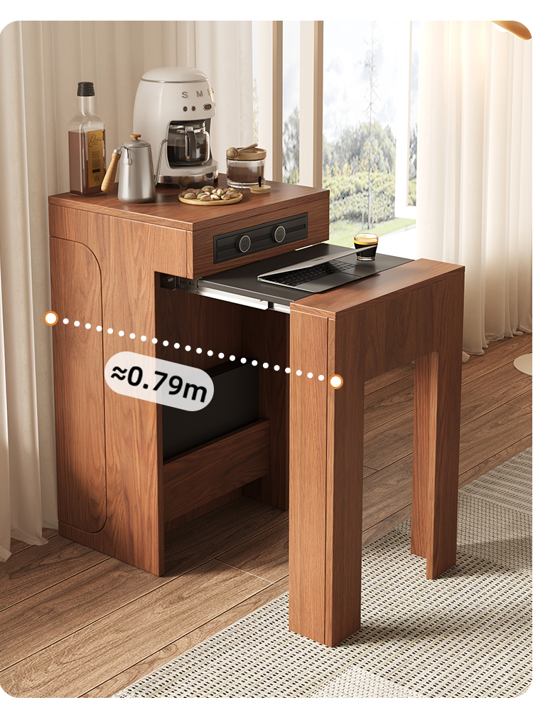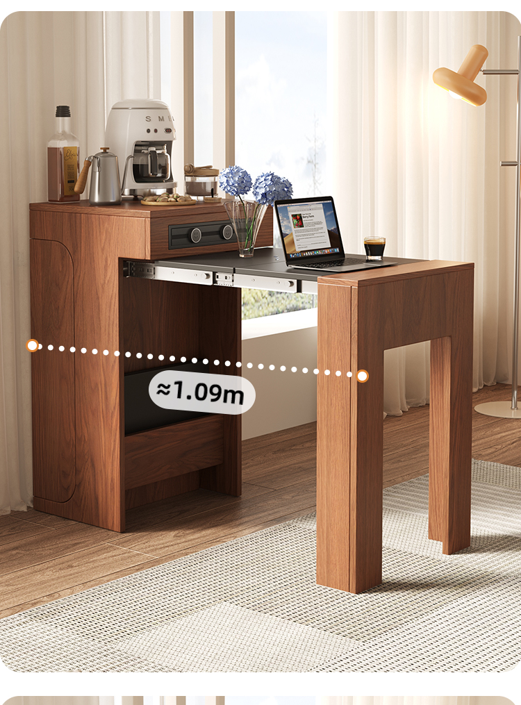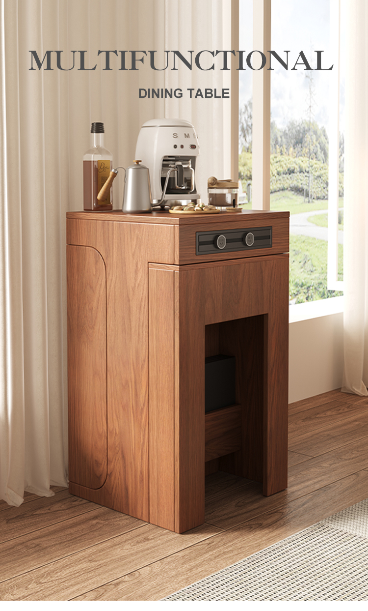 This multifunctional wood dining table features a space-saving, telescopic design. It includes an integrated cabinet, 3C certified power guide rails, and smooth metal slides for effortless expansion.